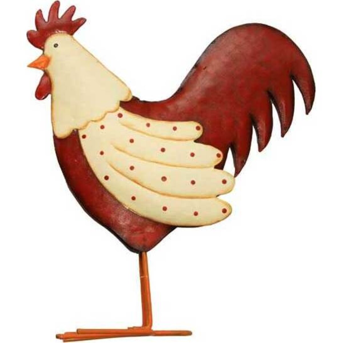 This large red wooden rooster is an attractive and eye catching item perfect for anyone that has kept or currently keeps chickens or roosters. This on trend item is styled with a two tone effect, the only variation from this design being the bright orange used for the legs and the beak. The large red rooster is painted and varnished, giving the item a lovely bright red chest and clean white feathers. The wings are cream, spotted with little red dots making them highly noticeable. The tail feathers are simply varnished in the same deep red used on the chest. All in all, the large red rooster has a lovely, simplistic design that is incredibly pleasing, and the simple but highly effective use of a neutral and bright colour will be sure to draw attention from passersby. The red rooster stands at a good size and can be placed anywhere in the home or garden.