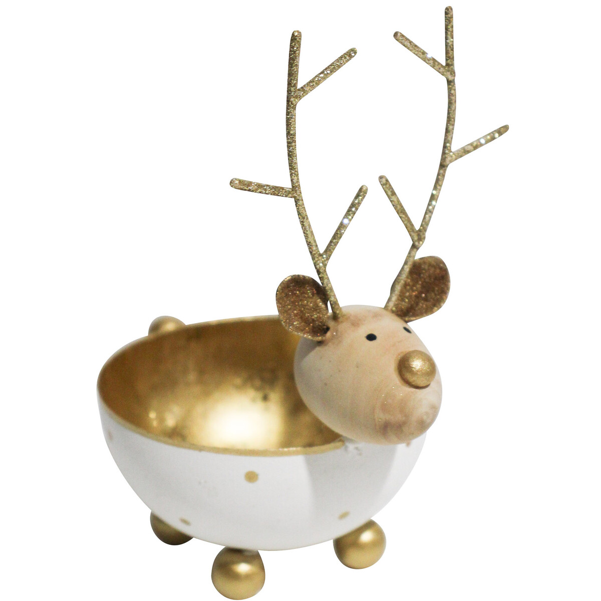 The bowl has been designed keeping in mind the myriad ways and means by which everyday use articles seem to don a whole new personal around the festive season. The bowl is about 13 cm in diameter and just about the same in height. Round tiny gold coloured balls make up its legs. The outer body wear a pretty shade of colour. The antlers shine golden and the pretty little head has been crafted from MDF. The round nose, the dark eyes, the adorable ears and the daintily crafted lofty antlers complete its look. Sure to get the mood of the setting. Despite being metal made, the body of the bowl is not too bulky or heavy and balances well on the tiny round legs. Makes a pretty little gift for the festive season and adds an accent that will gather quite a few complements.