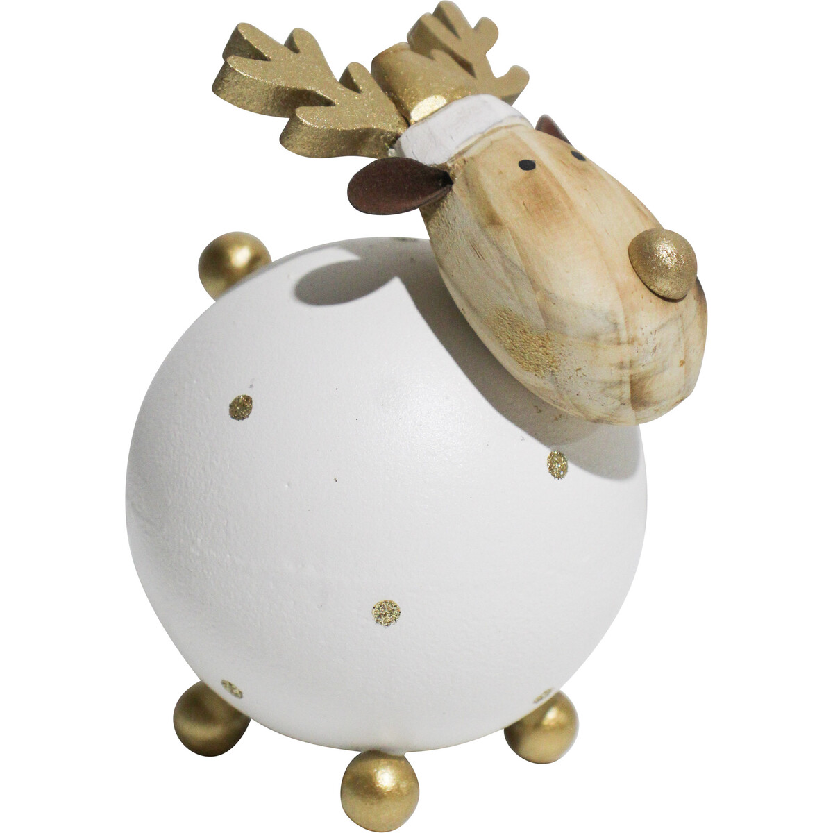 The Reindeer Clyde Gold is one of our Wholesale Sneak Peek products with an exclusive new design certain to intrigue and arouse the decorative interests of your savvy clientele. It has such captivating ornamental beauty achieved through its colourful combination of immaculate white, glossy gold, and natural wood brown. It is made of metal in a round shape while standing on four stubby gold coloured legs and a similarly stubby gold coloured tail. Its nose is also coloured in gold and has intricate reindeer antlers equally hued in gold.