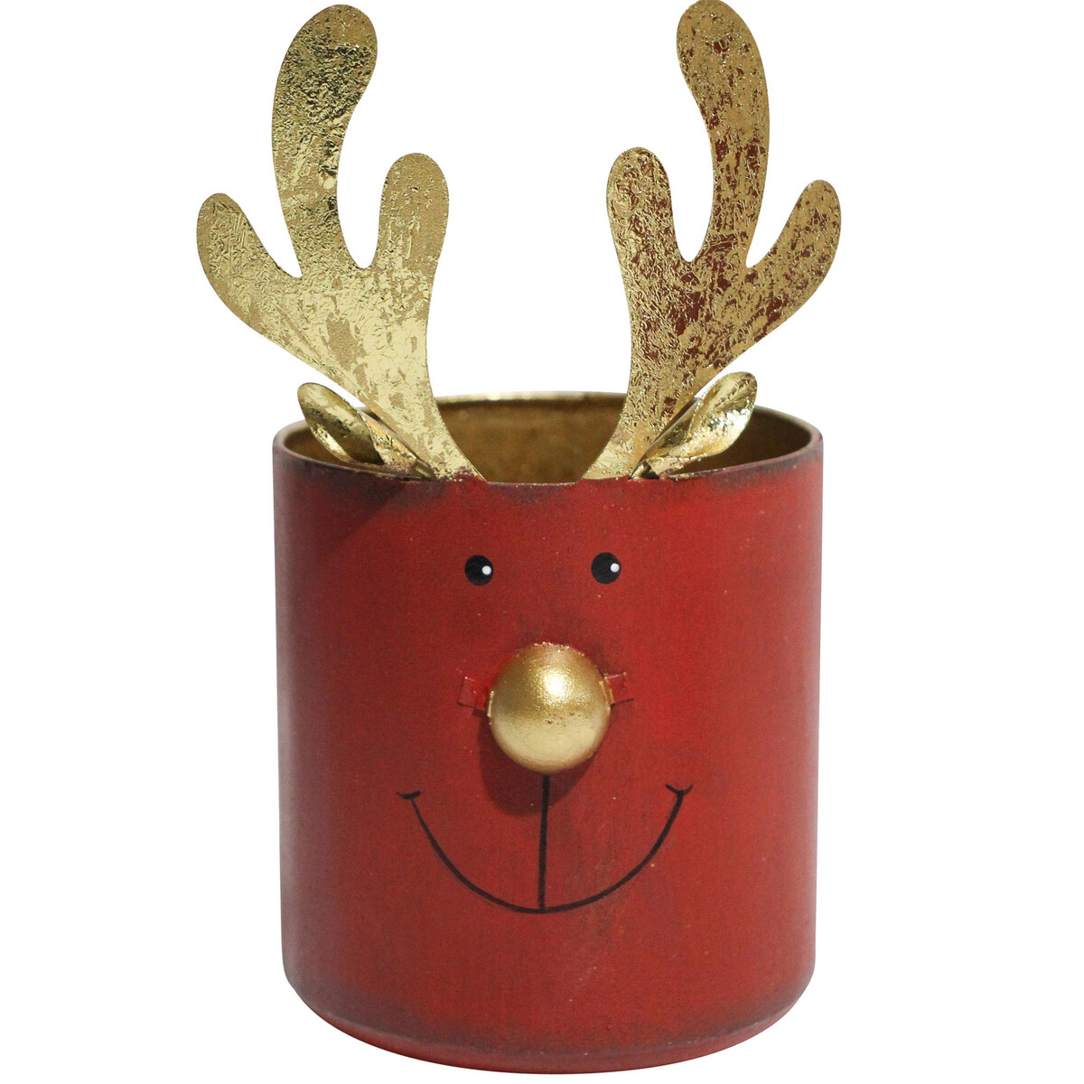 About 22 cm in height including the height of the antlers, and 12 cm in diameter, it's a delightful blend of rustic chic look and a touch of whimsy that adds to its unique kind of charm. The red colour is vintage and the gold stands out in all its glory on it. You could place a poinsettia or a faux plant in it,if you wish to keep things more basic. Could be combined with a similar pot in a smaller size to make more impact. The planter is sized for placement atop tales and counters and is large enough for placement on the floor as well. The metal made body is sturdy but not too heavy and the antler too have been given a curved shape that has been rounded off at the edges. Bring a reindeer into your spaces - after all Santa does not work alone!