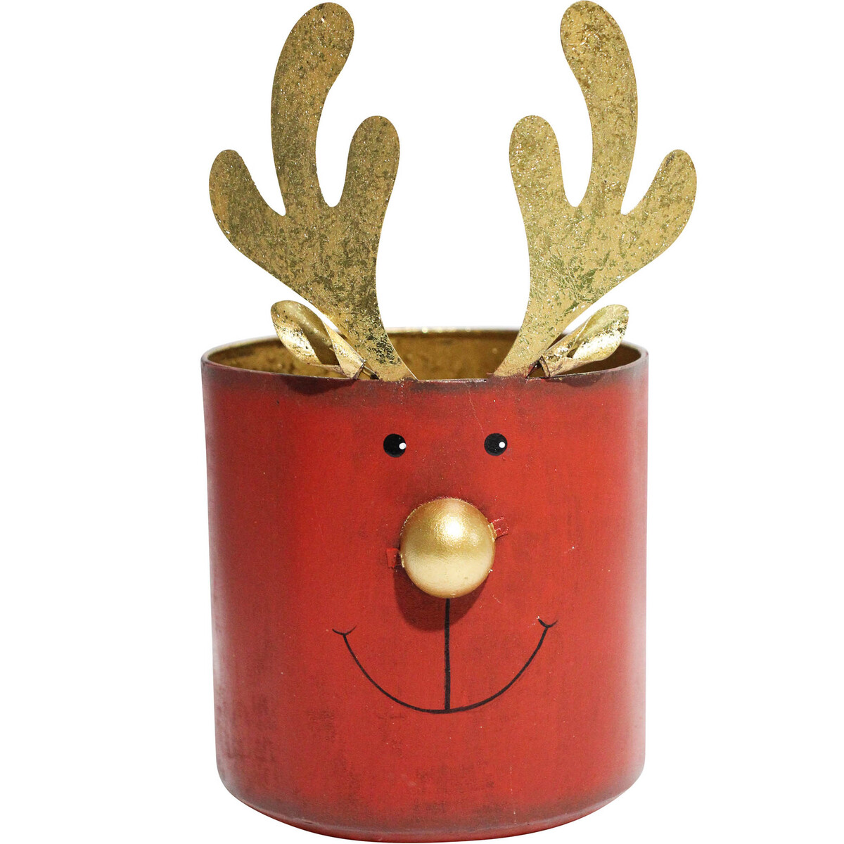 Made of metal the little planter features a reindeer - each feature well defined and making up one side of the planter's exterior. The adorable golden nose, the large antlers flaring outwards from the side of the planter crates the impression of a reindeer head with much perfection. The little painted eyes and the smiling expression are hard to miss too. Painted red which perhaps is the most loved colour of the festive season. Place it atop tables or make it art of your main arrangement where the presence of a potted plant will go a long way in adding more charm especially when it comes housed in its own Christmas themed planter. The piece is 17 . 5 c, tall which includes the height of the antlers and about 9.5 cm in diameter. Will be great for placing small faux ferns and even real potted plants that could fit into it.