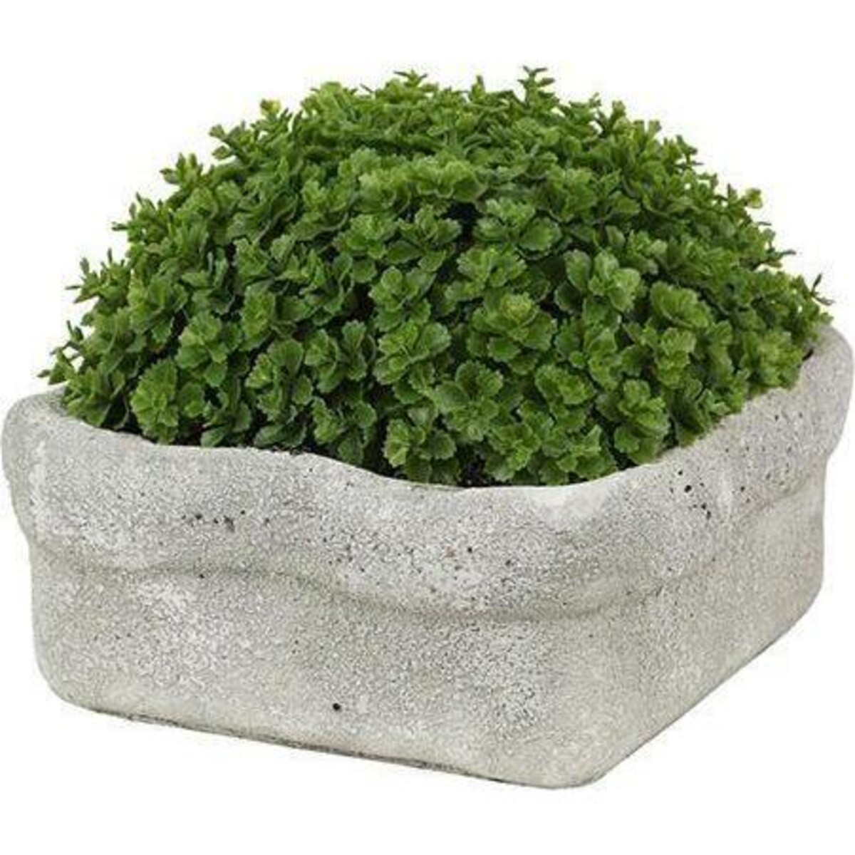 Plants of all kinds always lends spaces more character as they off set beauty of other things more accurately and in this case it is a replication of a hardy waxy leaved plants that comes with many leaves, almost like a tiny shrub. The short statured plants would be perfect for placing on tables and could be an attractive display in spaces that lack a touch of nature. Place it at tables near windows and let the natural light fall on it to set its greens aglow. You will be especially be complimented for the choice of maintaining the plant in such a healthy way! Little will they guess its synthetic nature! The look is truly natural as is the feel of the leave when you touch it. The resin planter looks like it has been molded from cement. The plant possesses an innate charm that will soften the look of your interiors and make it feel more inclined towards a natural theme. It will combine with all kinds of décor. This plant comes with a square white coloured planter that has an undulating curved shape. The height of the plant is a mere 15 cm while its square base has dimensions of 17 cm.