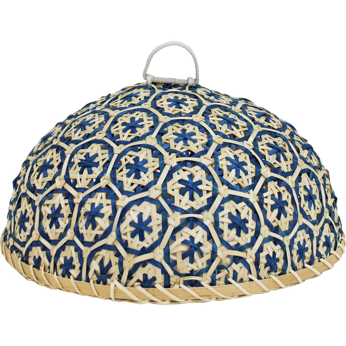 Keeping hot fritters covered makes them soggy because of the heat vapours and trapped moisture-while using woven natural material covers allows ventilation and thus the gradual cooling is allows keeps food from getting soggy allowing it to remain crisp and also free of any particle contamination. Will add the zest of colour and a touch of traditional flair to your dining table or kitchen counter. Keep your cookies, cakes, pancakes and sticky sweet or savoury preparations safe under this round dome shaped navy and beige cover. The top has a tiny little handle to lift it. The frame on the base of the cover makes it sit flat and that allows complete and gap free coverage. The dome shaped round cover is 30 cm in diameter and will complement your table setting with its neat looking finish and elegant looks.
