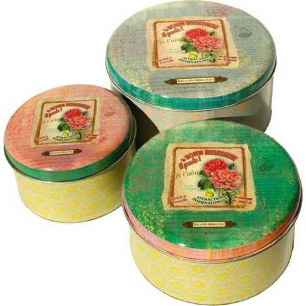 Evoking a sense of yesteryear, the Round Tins Roses Print S/3 from LaVida feature vintage - style prints of rose advertisements on three separate tins. Each tin is finished in a different aged colour such as fresh mint, soft blue or tender rose. Blended hues of yellow, peach and aqua can also be found on the tins with mix - and - match styling. Faded French lettering adds to the antique charm of each tin box. Perfect for displaying as a grouping on a desk or accent table, these vintage tins are also functional for holding small items such as pins, jewelry or even storing potpourri.