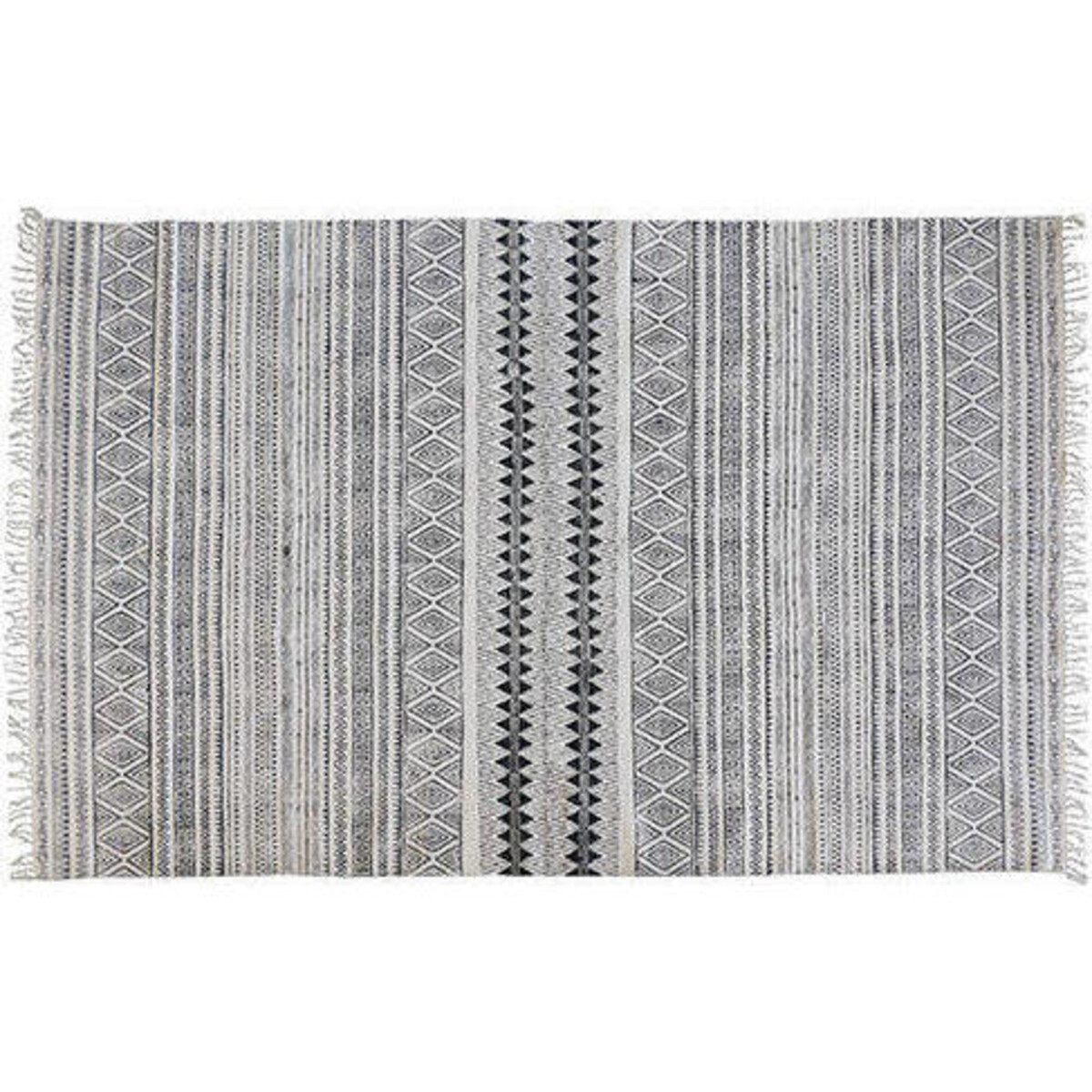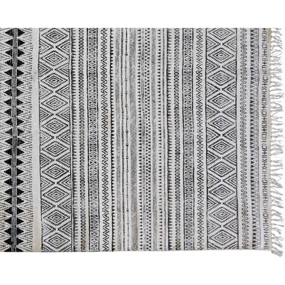 Rugs are a great means to give your décor a touch of luxurious comfort and what is most important is that they need to be easy to care for and cleaned, and in the case of this gorgeous woven and printed white and black rug, you could tick all of those boxes. The length of the rug is 240 cm and its width is 170 cm making it an ideal choice for your living room or your dining spaces as well. It can be vacuumed clean and since it is made of cotton it will not be averse to dry cleaning or washing. The rug is lightweight yet the yarn used in it is supremely tough, making the weave and the feel underneath rather soft. This area rug promises you lasting years if work underneath, keeping your room feeling fresh and alive with its presence and lending your décor the most needed basic backing. You will love its intricate pattern in black and its very natural feel tasselled ends.