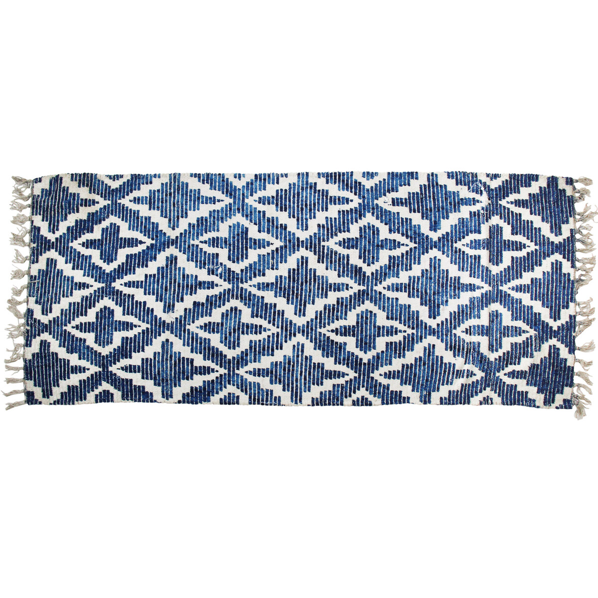 Chenille as material is being used in modern homes much because of its easy-care nature as also because of its great touch and feel and durability. Made from a combination of polyester fibre and cotton-the rug here is about 150 cm in length and 60 cm on width, making it most suitable for placing by the side of beds and in front of long couches and sideboard. Combines well with all kinds of décor because this typical ikat style pattern has cross cultural reference points. The blue and white are fresh and vibrant making them add a refined and finished look to the space. the runner is shed free and slippage free. Fringed ends complete its look