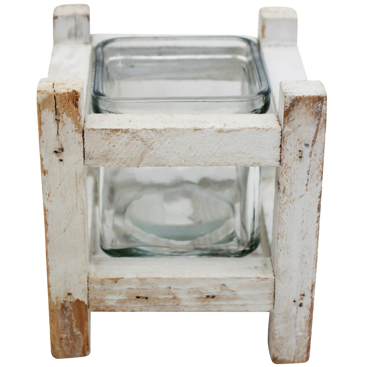 Fashioned from wood, this little candle holder is a simple design which is rustic, utilitarian and the kind of little accent for table tops that will combine beautifully with wooden table tops and the likes. The glass votive it holds will hold your candle steadily and can easily be eased out of the niche where it stays undisturbed. The peeled off white paint, weathered wood, rough and ready-not finished to slick and stylish look adds to its attractiveness. The square piece stands on the legs that are structured from wood and holds the little votive which settles in holding small to medium candle quite easily. The votive itself can be removed for clean ups when need. Make a set of a larger version of the same stand which can then be paired to create a rustic table top statement. Repurposed wooden piece such as these come with characteristic imperfection lending more charm to their look setting them apart.