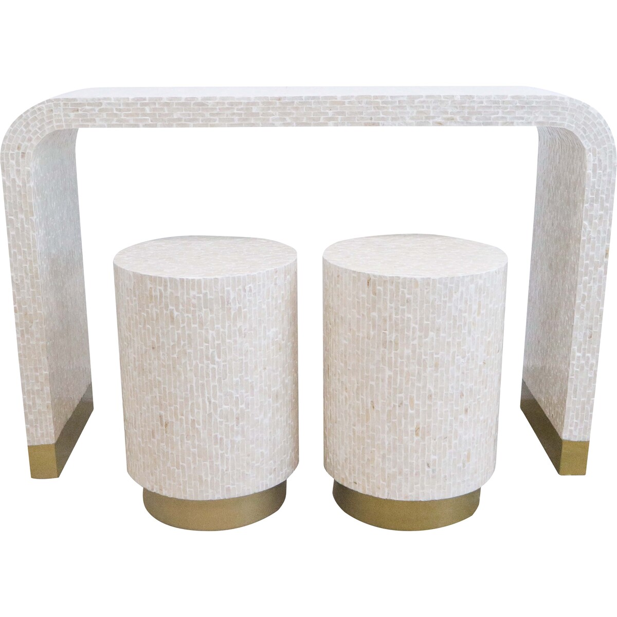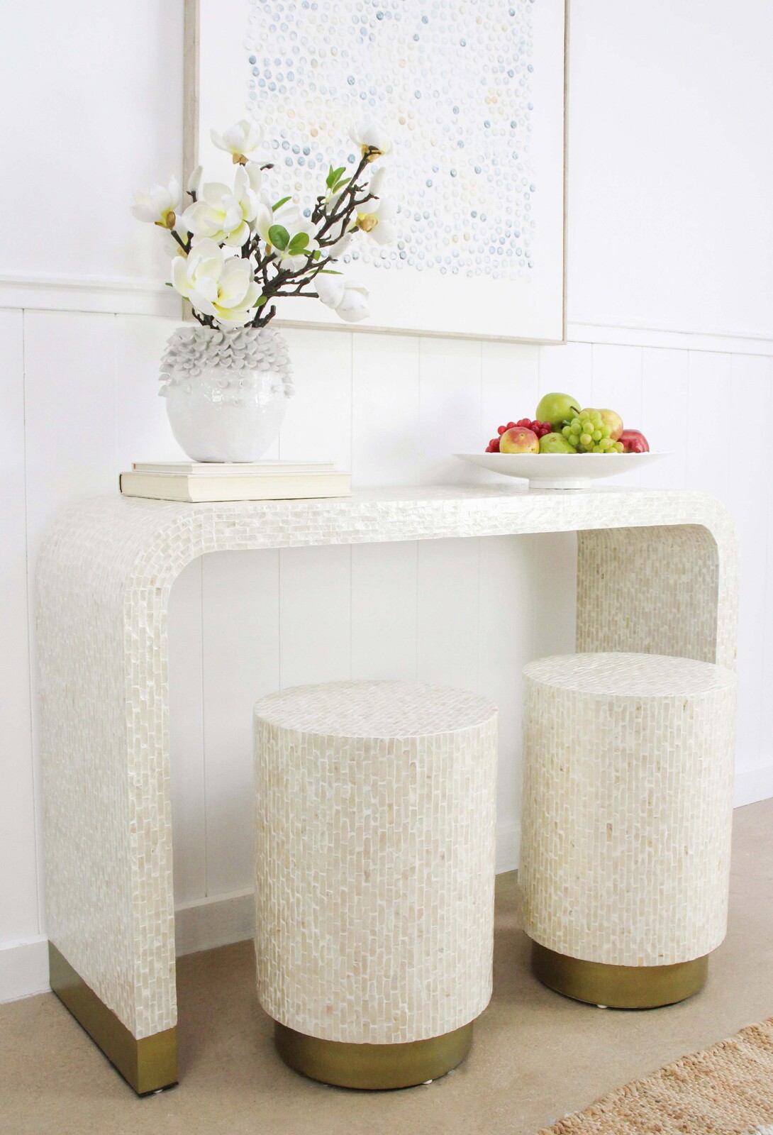 The console table stands at 120x38x80cm and the side tables at 35x35x51cm. Together they have a rounded silhouette with a creamy finish - perfect for any living room or lobby needing softer lines. We’d recommend keeping them away from direct sunlight - it helps preserve the shells’ lustre, keeping everything pristine for longer. Great set for interior designers too - very modern but not stark, plays well with minimalist or coastal spaces.