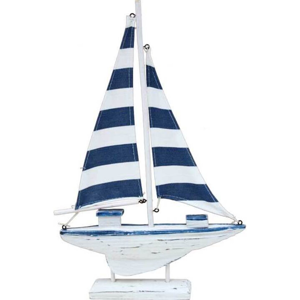 é The boat is lifted on pegs that rest on a flat base, so it's free standing and can be placed on a shelf, table, or counter. é Two navy and white striped cotton canvas sails - mainsail and jib - are rigged with cotton cord into eyelet loops, and are topstitched around the edges for a realistic look. é The main mast and boom are constructed from dowels and painted white. é Rudder and hull are painted white with blue trim. If you need to increase your inventory in gifts and seasonal items, collectibles like this one are winners that appeal to anyone who love the beach, boating, or nautically themed items.