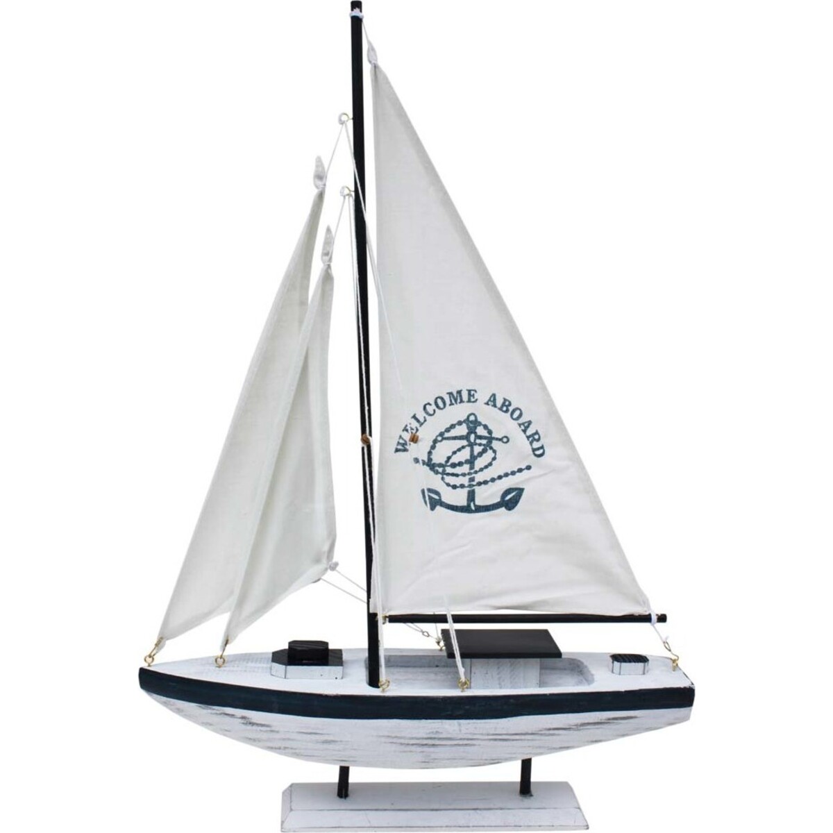The blue and white boat has a slightly weathered appearance that enhances its appearance. It has a dark mast, white sails and sits on two dark pegs on a white rectangular stand. The mainsail has a blue anchor on it with ?Welcome Aboard? printed above it. Although they perfectly complement any home that's decorated in a nautical or coastal theme, it can add a touch of class to a home decorated in any style. It would look great placed anywhere in the home, especially on a fireplace mantle, end table, coffee table and front or back porch. This item is quite the conversation piece especially for sailing afficionados and everyone will want to get their hands on it.
