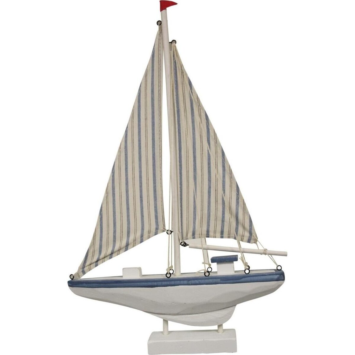 Who can resist the salt soaked balmy winds or the sun on the face as you devour the sights of the beautiful beach and making your seaside home or marine themed home feel the freedom and the adventure of the sea all the more will be easy with this model sail boat. Made from high quality materials that have been hand crafted, it sports the best possible real-life features that make it so special. The white and blue colours on the boat adds to its fresh appeal. The tall mast rises to a height of 43 cm while its main hull and body is also in soft marine blue and white. The handcrafted piece looks all the more stunning when the entire décor comes together with the boat at its centre-add shells, marine creatures and plenty of white and blue shades to bring alive the setting to suit this gorgeous boat for display. The boat sits on its stand like structure and holds its mast high as it simply impresses all with its beautiful craftsmanship and its accuracy of size and dimension.