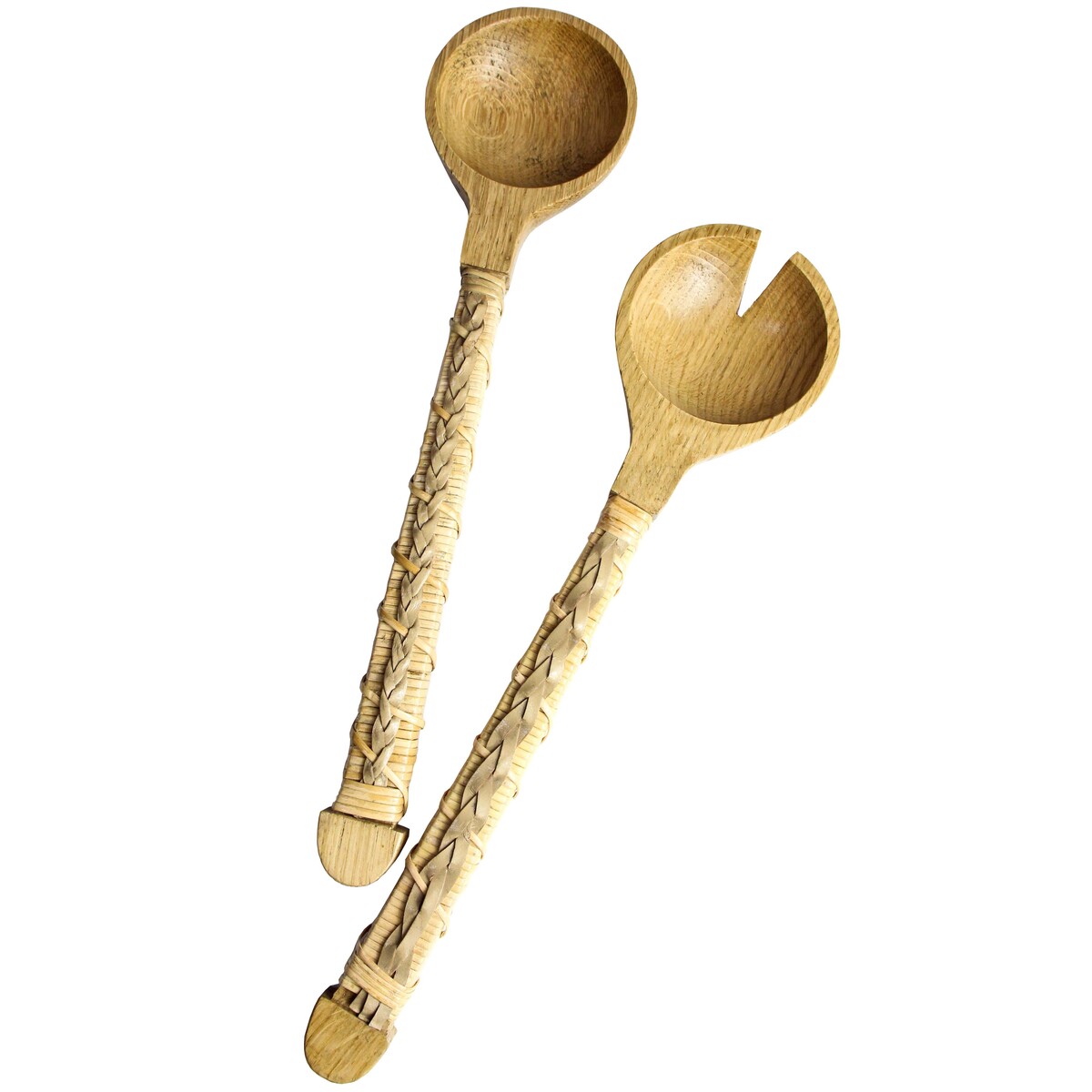 Each pair measures 30.5x7x2.5cm and includes two distinctive designs to serve together as a matching set. The intricate handles feature woven rattan with a smooth shape that feels lovely in hand. And because they’re handmade, each pair has slightly different characteristics in colour and finish - it’s what makes them feel so real and alive.