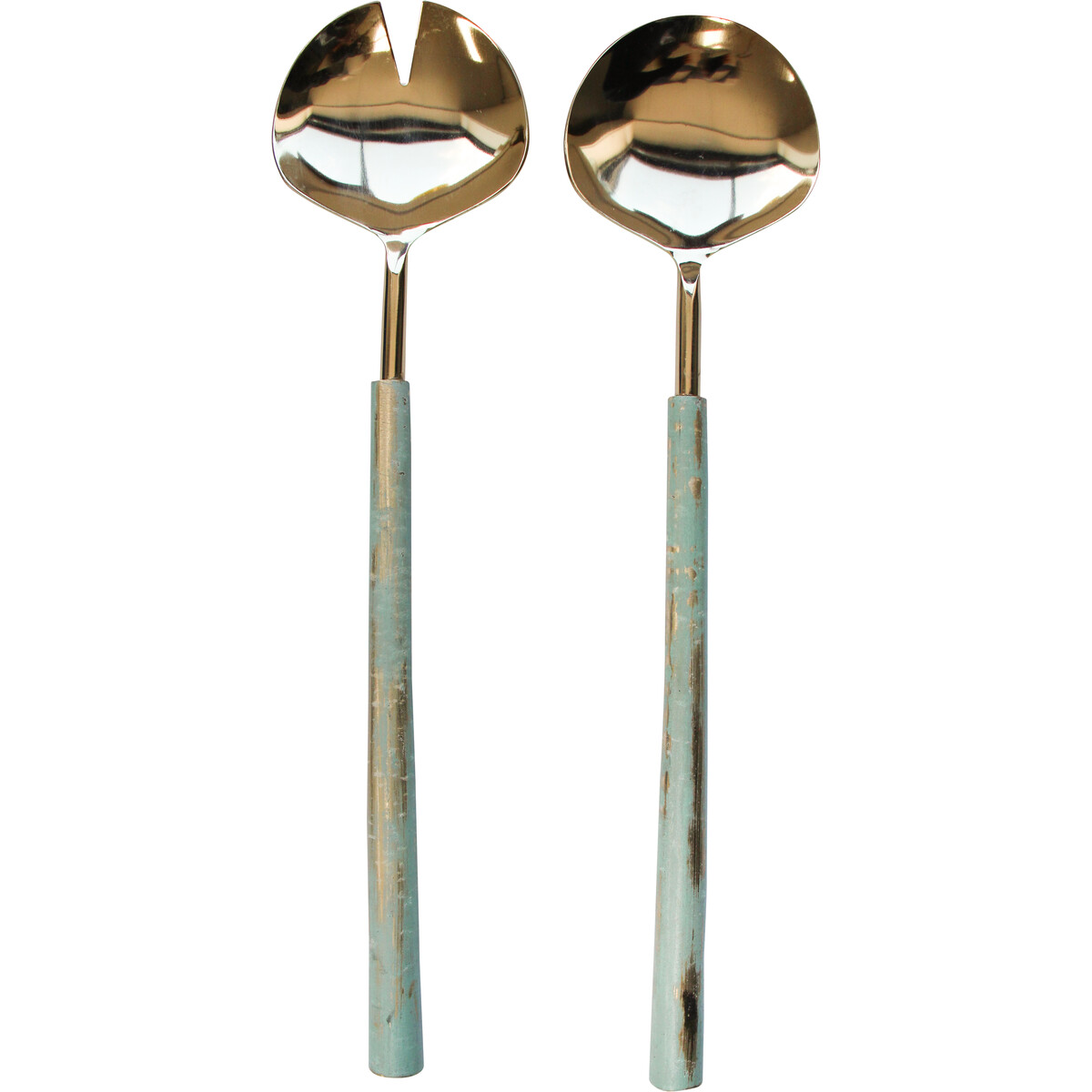 Deliberately crafted in a design which has long customer-friendly handles that offer firm and comfortable grip to every user, this Salad Servers Beverly Hills S/2 was made to be immensely functional. Apart from its practical functionality, it is also ornamental as each of these spoons display a perfect balance of durability and aesthetic appeal through its artful shapeliness and choice of palette. The palette showcases a beautiful blend of lustrous gold hue with that of the relaxed soft shade of blue. Thus, these spoons would elevate the decorative outlook of any and every dining table where it is being used.