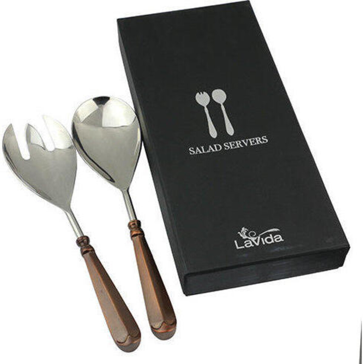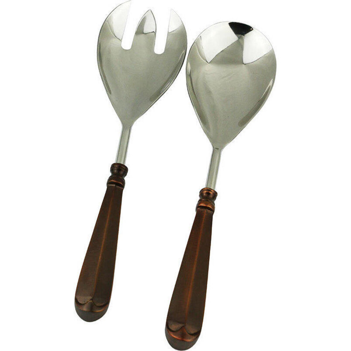 You do not like the mess when the green shift from the bowl to the plate and would like to drain the juices well before doing so-here is a set of fork and spoon with large spatulate ends that will allow you a great grip of greens an dalso add that touch of class to the table. Salad serving does needs a certain amount of expertise that can make all the difference to the way it is served. Ease out the way it is dine with the help of right kind of spoons. The steel and brass combination lends a colour duality you would simply love. Gives a vintage touch and also makes the rest of the setting gain a certain kind of class. The length of the spoons and their grip makes the serving easier and the look of the servers bends in well with all kinds of table settings.