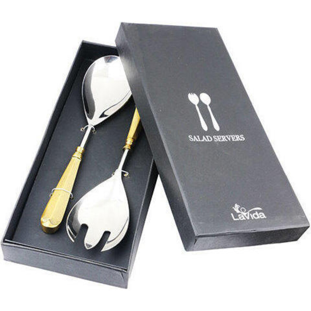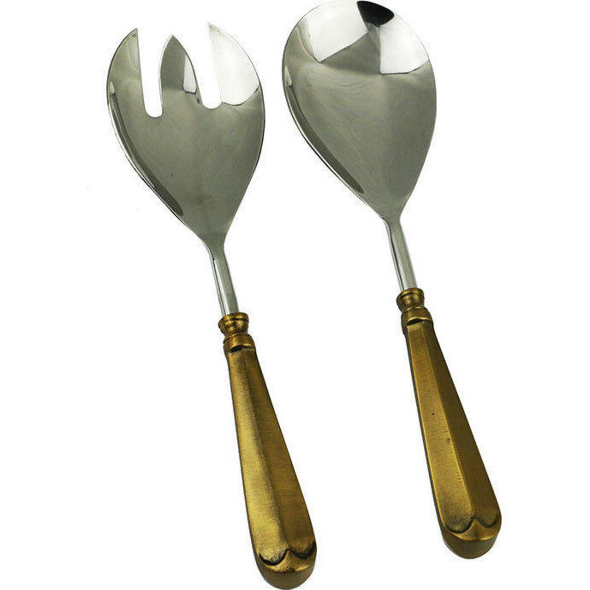 Bring on the suave look the French way with the Laiton set of serve ware which makes your salad serving so much more eased out and less messy. If you love your greens and wish to serve it too make sure to have this set handy which consists of a spoon, a fork and is highly giftable. Sure enough anyone whose love for salads is known to you would love to own something as great looking and functional as this set. High grade stainless tell meets a lovely dull gold in the handle. The forging of the pieces and the styling of the handle with its faceted design gives it a smart, urbane yet very classic look. The dull brass handle makes the appearance gain a sort of vintage appeal. Make your table setting reflect more polish and finish the next time you decide on serving some fabulous salads.