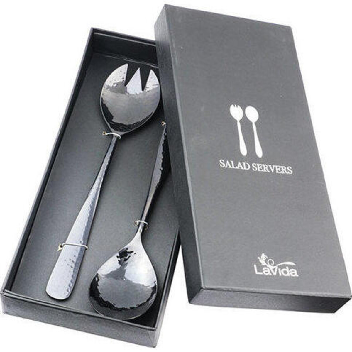 Give your serve ware a facelift with the help of these exquisitely crafted serving spoons from Lavida that knows that be it soups, breads, cheeses or even salads- they all must be accompanied by the best on serving spoons and in this case this 22 cm long trowel and spoon is perfectly suited for accompanying salads. Made from high quality stainless steel, the set comes neatly packed in a box and can be storedin it too. The design of dimpled metal is truly very stylish and makes the rest of the table setting go up notches higher in terms of style. The steel is tarnish free and to keep it shining bright it will simply have to be washed and wiped clean. The set has a round spoon with just the right spatulate shape while the trowel like fork is suited fine for easing out the picking and transferring of chopped vegetables without making a mess all around. Easy to grip, sturdy and really designed for perfect accessorisation of the table.