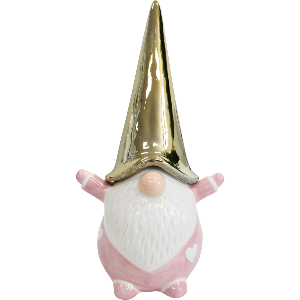The peaked golden hat makes this Santa a tall and hard to miss addition to your décor. About 22 cm in height and with his arms outstretched -he makes his presence felt as much with is unmistakable flowing beard as he does with his delightful pink attire. make it part of your decor-gift it away this holiday season and make the pink Santa quite a symbol of generosity and joy. The ceramic has a fine sheen as does the high shine of the gold of his hat. Will stand on your mantle or your table top inviting most loving looks and spreading his usual message of joy and contentment with its little presence.