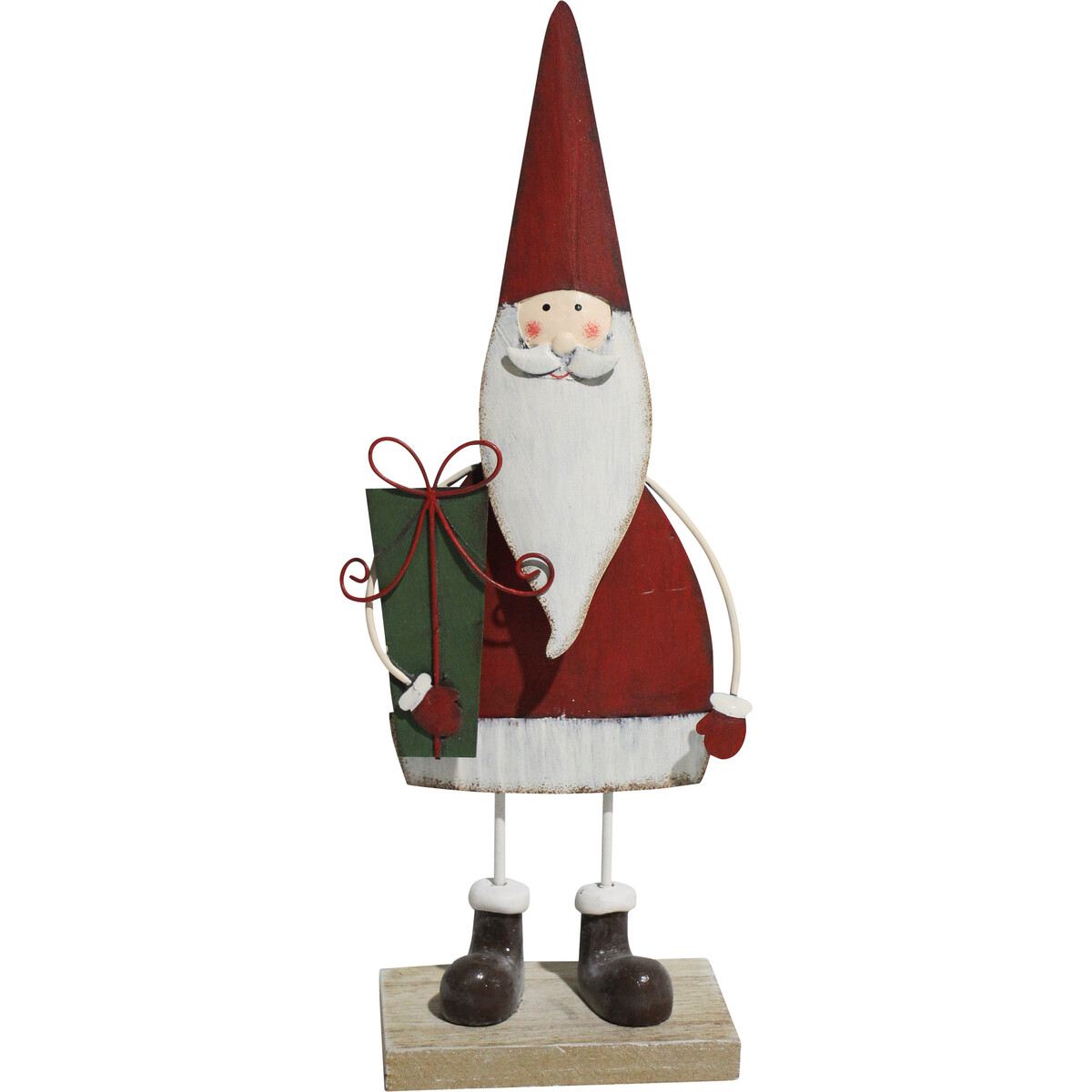 The rustic chic element of the figurine adds a great deal of charm to this accent. Could be used on table tops and will add that essential Christmassy vibe to the focal point of your décor for the holiday season. Crafted from MDF which forms the base of the stand - the Santa figure is crafted from metal - the red hat rising up to the furry white top - the red coat and its trim of white fur to the little gift he holds in his right art - the tiny boots - all of these details apart from the most loved face - adds to the undeniable charm that Santa exudes and has continued to over ages. Making him part of your festive décor adds that much needed touch of wonder that his presence evokes. Could be placed near the chimney where you hang the stockings - or tight under the tree along with the gifts - or simply have him as part of your entryway console where his presence could greet guests.