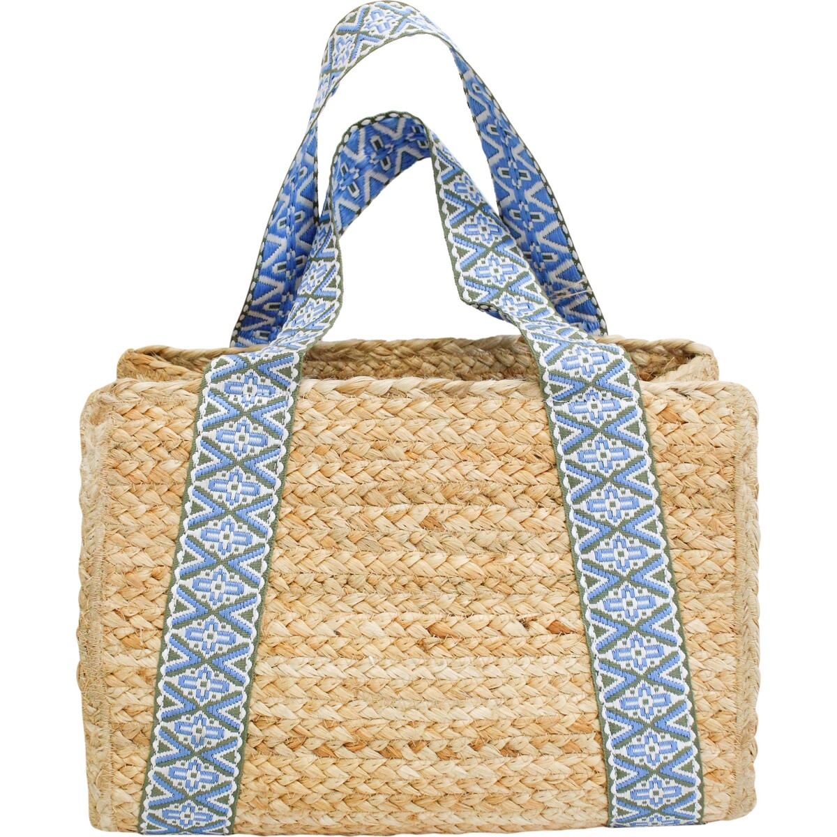 This shopper bag's unique handwoven charm is enhanced by its subtle colour variations and artisanal finish, ensuring each piece stands out as a one-of-a-kind accessory. The stunning blue patterned straps provide both comfort in carrying and an eye-catching contrast to the earthy jute, making this bag a harmonious fit for an array of decor styles, from rustic to coastal, bohemian to contemporary.