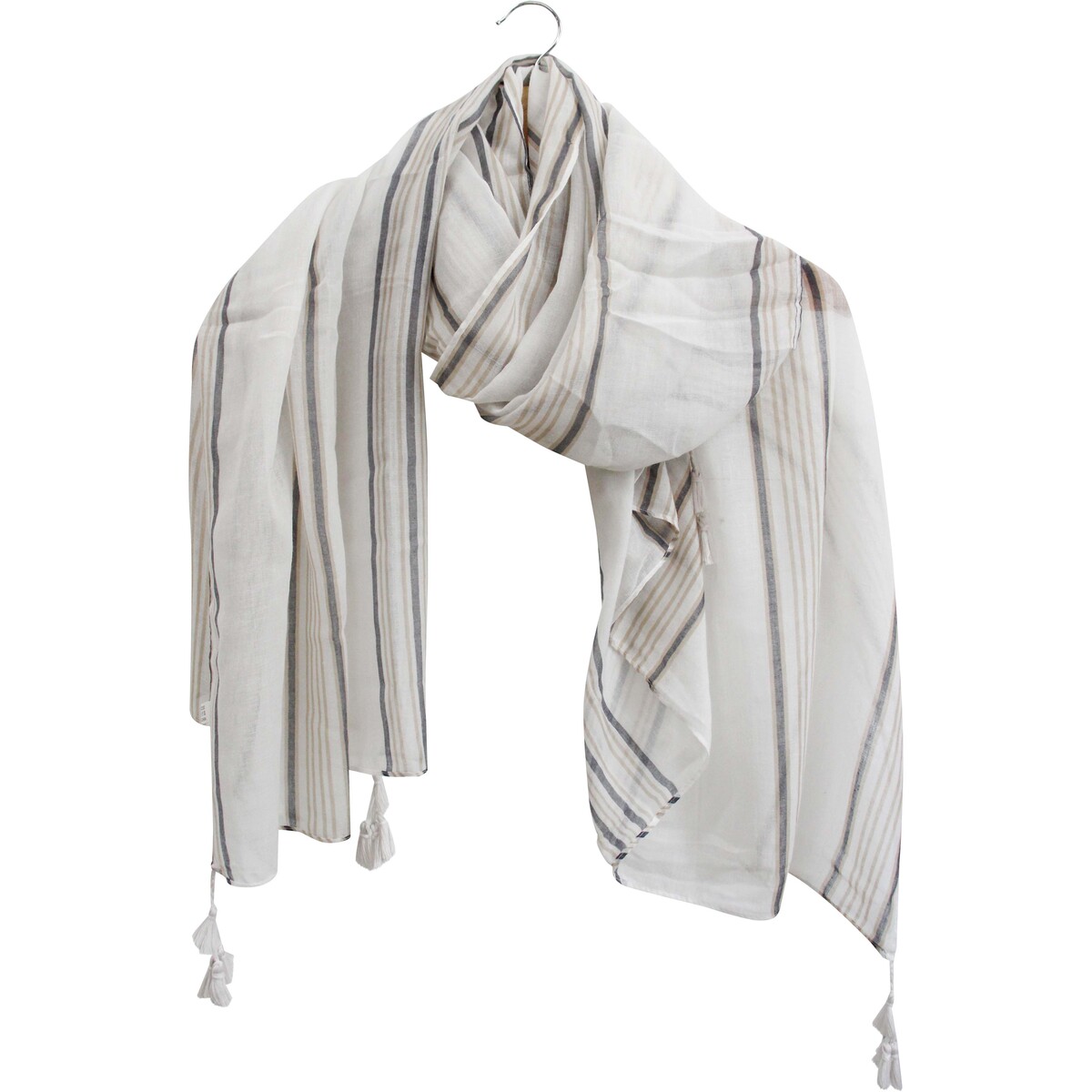 With this design, everything is about flow and adaptability. We've chosen polyester for its lovely softness and airy drape. That classic neutral palette - white with gentle tan and grey stripes - means it just goes well with everything. Being 90x180cm gives it plenty of length and coverage, so it can be artfully wrapped, knotted or folded to suit personal style.