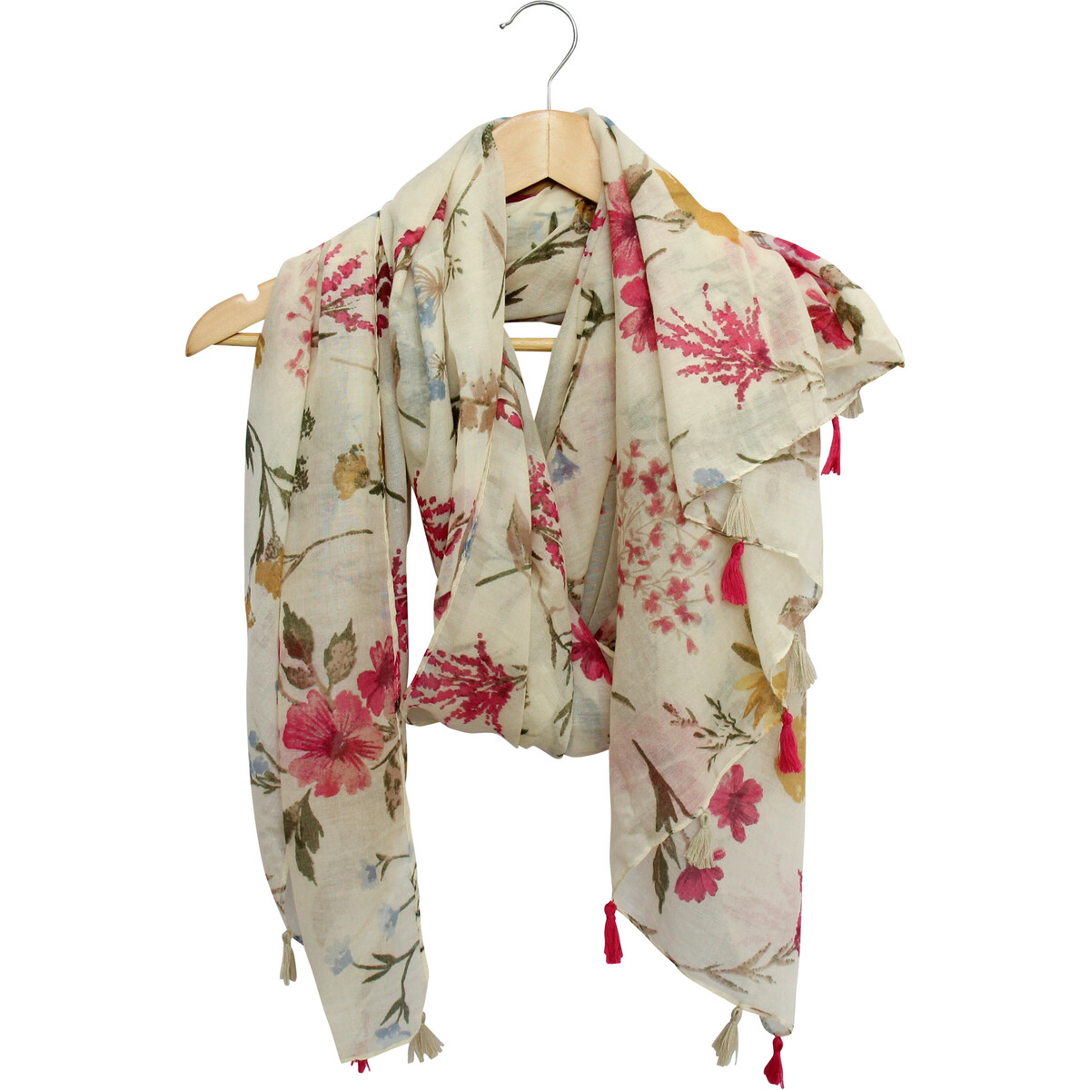 The fabric used is polyester that not just drapes well but is skin friendly and adapts well to any other material it is used with. The drape it creates is soft and flowing while not feeling heavy or difficult to handle. The length of the scarf is 180 cm and its width at 100 cm makes it large enough to style like a sarong. While using this around the neck, the fabric does not feel too heavy and its print adds that summer freshness to your look style it with a dress, your shirt and jeans or your beach wear and it will go in tandem without any fuss. The tassels in pink and white completes its look perfectly.