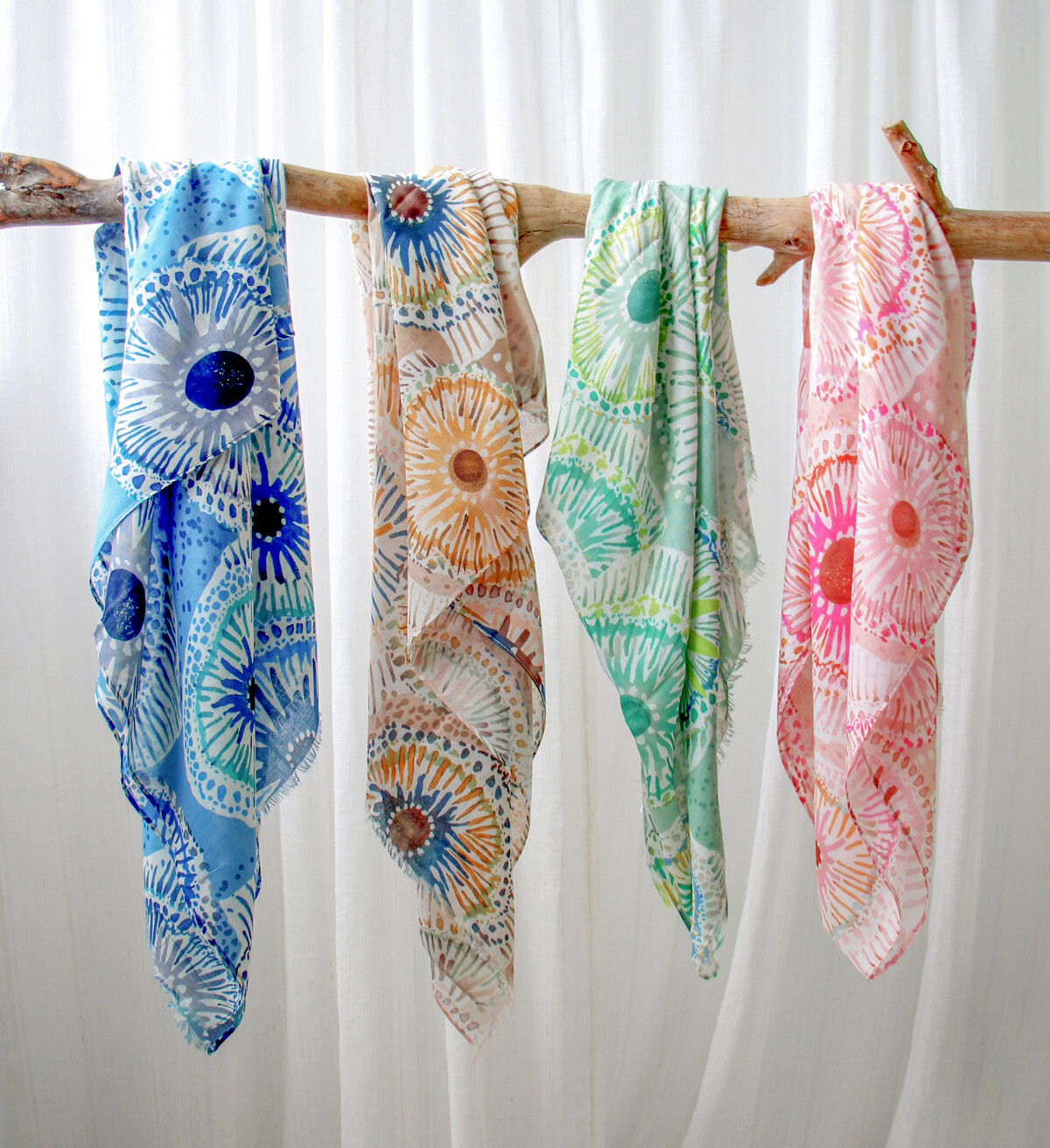 There’s something about this scarf - one that we see is made from 100% polyester fabric with a hand-feel and drape not entirely different from silk. It’s rendered in a mostly oceanic theme with swirling round sunbursts, half-moons and petals arranged along the hem of the scarf as well as working its way into smaller details throughout; most of what draws your attention comes from the blue-green hues that seem to stretch far down the length of this piece. It’s easy to see this slotted into more nautical or even coastal retail shops for how bright it is, but truth be told it finds use in any shop because of how easy-going it looks.