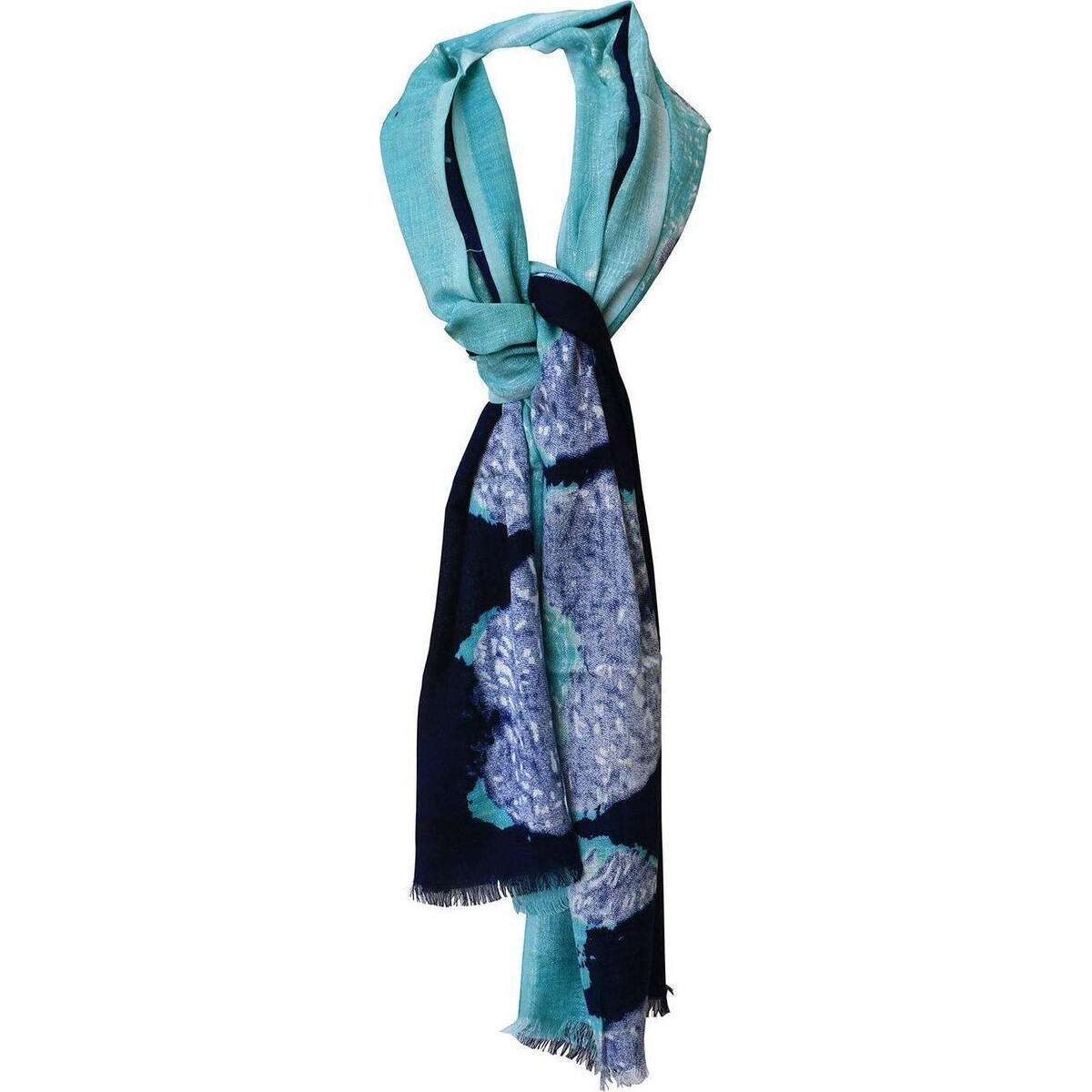 Turn the pages of any fashion magazine and you will find it on the impossible to miss accessory list. Make scarves a regular part of your dressing for a languid relaxed look to a true professional smart attire that speaks cool confidence all ver. This 100% cotton linen blend scarf has a rich marine blue as its most important feature that also displays hues and patterns through colour usage. The lighter blue that is in the middle gives way to dramatic deep inkiness, to a turquoise, making it such a splash of coolness on summer days. Wear it to work or for a day out shopping and you will feel its soft organic feel such a lovely touch on the skin. The scarf is 180 cm long allowing you the possibility of knotting r simply draping without the stress of less length. The width of the scarf is 80 cm, thus making it wide enough to drape it more like a stole if you so desire when the winter does get cool. A lovely organic feel fabric that is as great for early autumn as it is for summer.