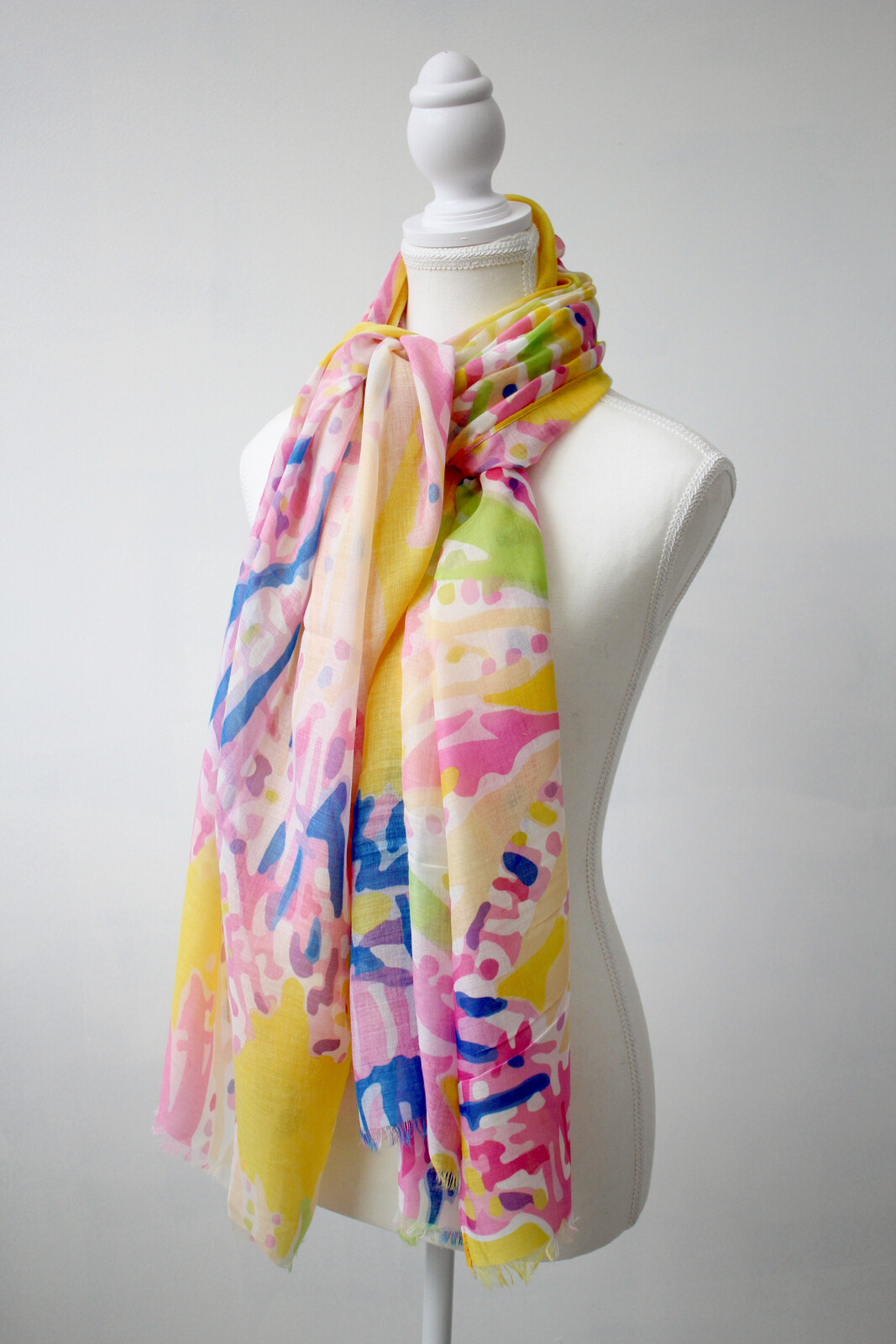 With an abstract pattern featuring yellow, pink, blue and hints of purple or white swirling around on a semi-sheer material, this scarf instantly brightens up any outfit - we’ve seen people pair it with casual resort-wear and sharp contemporary looks alike. The pops of colour paired with pastel shades make it eye-catching while remaining subtle enough not to overpower everything else; when displayed on shelves alongside more neutral-toned scarves in your range we guarantee buyers are likely to gravitate towards this one first (in fact that’s what most stores tell us happens).