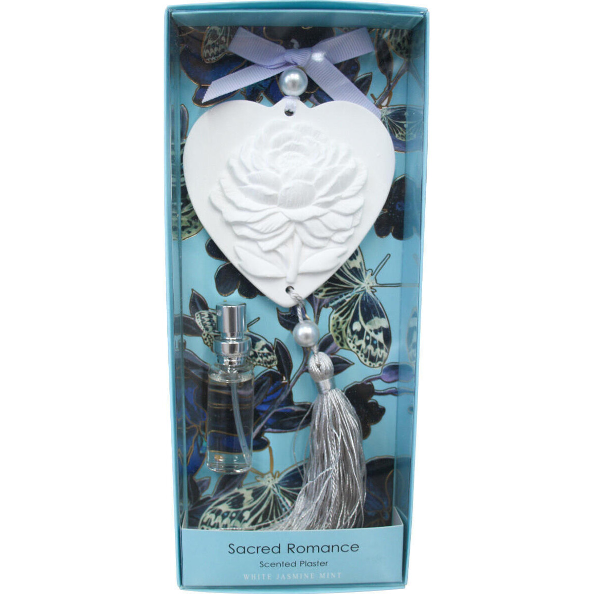 Make that beautiful change in the manner in which your wardrobe and all kinds of closets smell with this adorable plaster made hanging heart that has been infused with a perfume that is light, airy and full of charm. the ribbon in satin on the top and the tassel at the bottom adds to its beautiful looks, while its design enables easy hanging inside cupboards. To lighten up the air, simply spray the plaster made heart with the perfume that comes with it and it shall instantly absorb the fluid retaining it and dispersing the fragrance ever so slowly and mildly yet effectively. Will make the space feel and look beautiful too. The heart is all of 24 cm in length in all, has a lovely white alabaster like colour with a large floral pattern on top in the same colour as the base that lends it such an attractive look.
