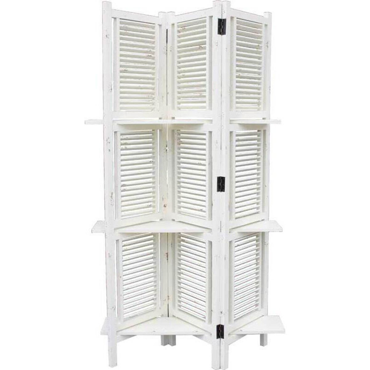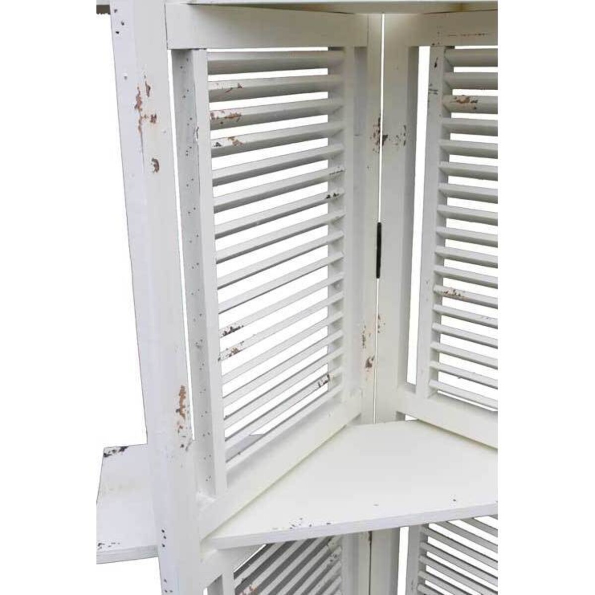 The shelves are cream in colour and feature angled louvre panels that reveal flat shelves in between. They're slightly worn to give them an aged appearance, as if they've been used for many years. Not only the shelves functional in that you can use them to display a variety of items, but they can also provide a bit of privacy. They're great to use in several areas of your home, such as in a bedroom or even in the living room, and they're certainly going to get you quite a few compliments.