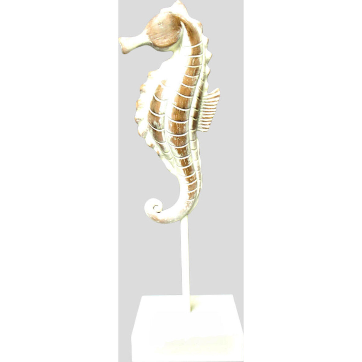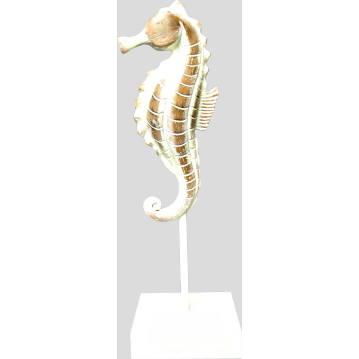 Give a gift of absolute wonder to your marine and coast feel home with this splendid inclusion that showcases not just the superb workmanship on timber, but also places the centring of the theme around it- a beautiful seahorse whose very detailed shape and beautiful features will make every other accent revolve around its presence. All you would need to add area few shells, maybe a ship in a bottle and some shabby chic pieces around it to build in the right kind of backdrop. Gorgeous colour scheme in beige and white gives it more uniqueness. The height is al of 15 cm and the fact that it comes sturdily sitting astride a stand gives it more beauty. Easy to display on mantles or tables-it will set the look apart with its subtle and impactful presence. Especially adorable are its curved body, the fin and the delicate head shaped like that of a horse which has never failed to fill one with wonder.