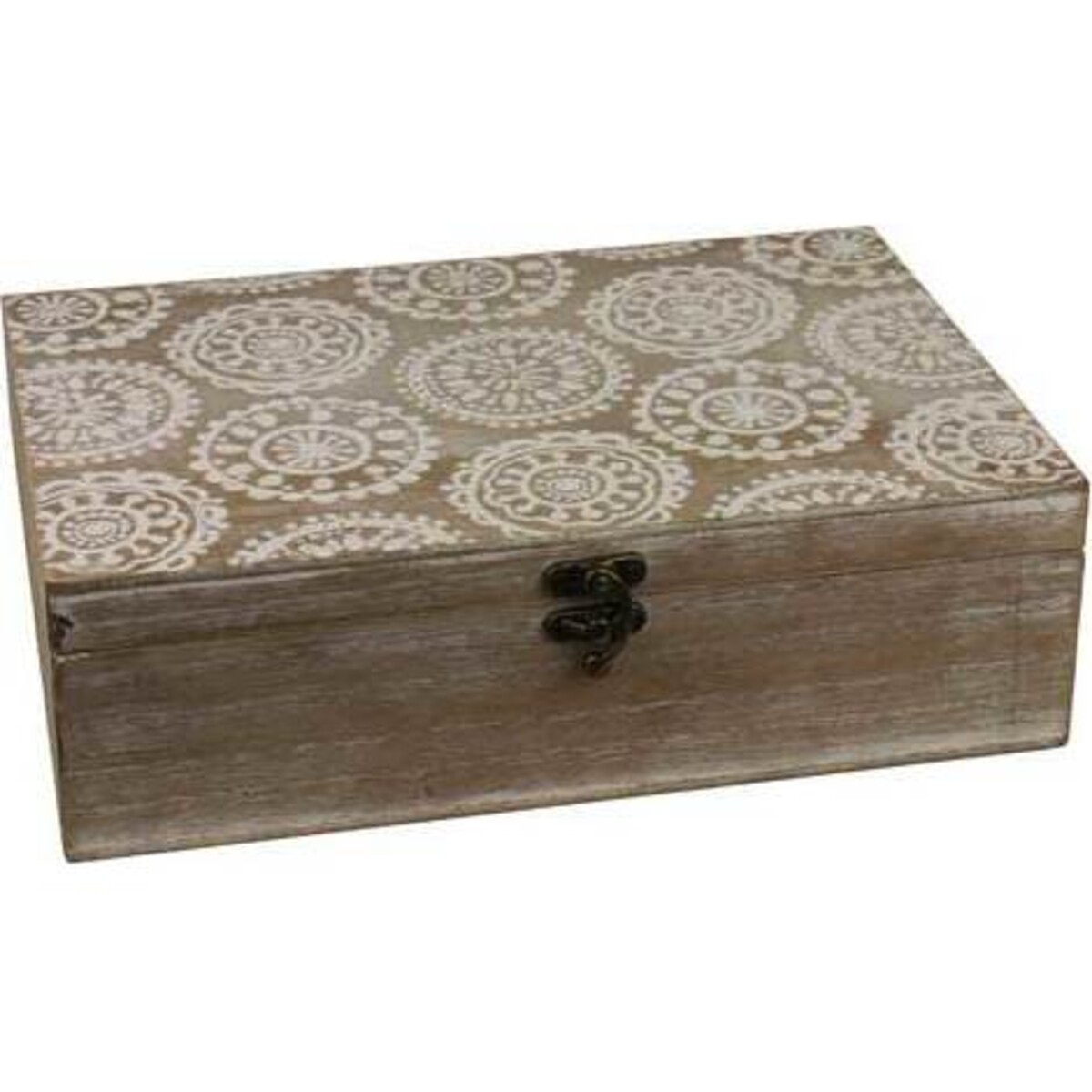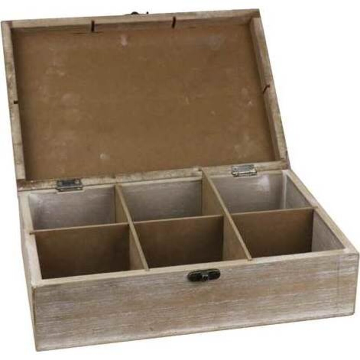 About 28 cm in length, 19 cm in width and 9 cm in height makes it a rectangular storage box with six units of paces that can each be used in different ways. So if you happen to be a trinket addict here s the box for all your treasures and if t s keepsakes, this again would be sufficient spaces for them. One could use it in the kitchen to keep spices or simply to use it as sewing box with a collection of buttons and hooks and all those things that we need for this craft. There is never an end to finding boxes and organizers in homes and there is always someone looking for that exclusive space for his or her things and with a box this size and a design that pleasing anyone would love to own it. Comes with a solid lid that can be closed with a metal latch. The charming shabby chic like design elements like the white washed looks and the faded print in white on top.