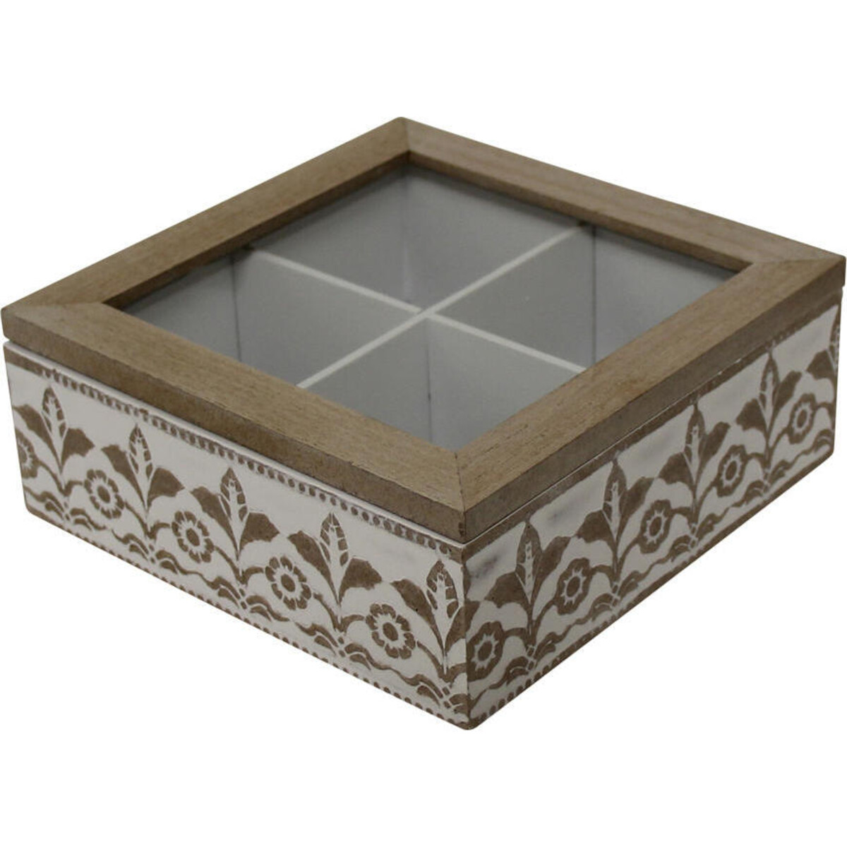 A square box made of MDF, that has 16.5 cm dimensions, and the kind that replicates the look of wood with such perfection, truly makes it a storage option worth possessing. The sectional box has four compartments that in fact is visible from the top as the id is made of glass. Be it a variety of trinkets, small keepsakes, or simply spices of the exotic kind there is adequate space for keeping them here. The advantage is that one need not go searching for them all over the place as you could get a good look inside the box anyway. The white and beige coloured pattern will complement any vintage and heritage look setting. The superb finish making the box feel like a classic old wood made kind , is because of the artistry that it has been imbued with. Placed atop your dresser or the sideboard with your tiny possessions in them, it still would add to the look of the space. Add more such boxes to your collection for ensuring that your treasures are yours for ever.