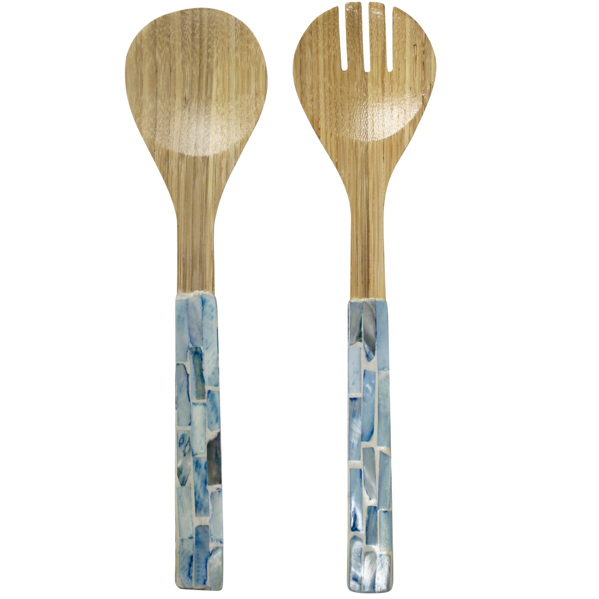 We really believe our Servers Soft Blue S/2 are a beautiful addition to any homewares or gift shop - they are not just for serving - they are a subtle way for people to express their unique taste and style at the dining table. Crafted from bamboo and featuring a lovely mother-of-pearl inlay on the handles, these measuring about 33x8x1.5 cm each, have a natural elegance that instantly brings that refined yet relaxed coastal feel into any space. And there is something special about handcrafted pieces - each set shows slight variations in finish, size and colour due to its handmade nature, making every piece unique. This isn’t a fault but actually part of what makes them so appealing as gifts or for personal use - customers will want to treasure them.