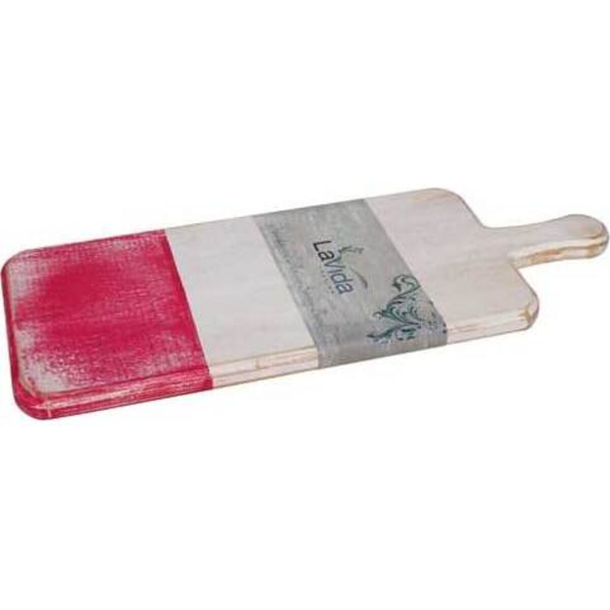 The Long Magenta Serving Board is made from solid wood and shaped like a rectangular paddle, with a comfortable handle grip that tapers toward the middle. A raised bead of wood surrounds the board for a decorative effect and to help keep drips or spills from running off the board. A splash of magenta colour is washed over one end, leaving plenty of working surface. When covered with food, the colour peeks out beneath providing a beautiful and colourful background for your culinary offerings. Restaurants can use this board to serve mini dessert combos, appetizers, or elegant entrees in place of ceramic or porcelain dishes or baskets. Stores, display with your kitchen utensils, packaged goods, or gift items.