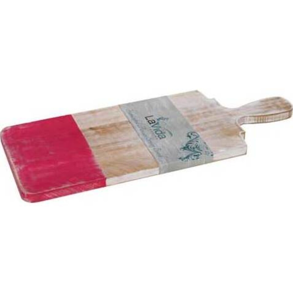 • The artisan design features rounded corners at the top and squared corners at the bottom of the board. • Long rectangular shape features a notched top edge that leads to a smooth oval handle with a comfortable grip. • Natural wood resists bacteria and is easy to clean. • Boards can be stacked or placed upright for easy storage. • They're versatile enough to present breads and baked goods, dipping bowls and sandwiches, or plates. • Artistic splash of colour adds to the hand crafted appeal. Be sure to stock all colours, sizes, and silhouettes so your customers have choices. They work with all decors and themes.