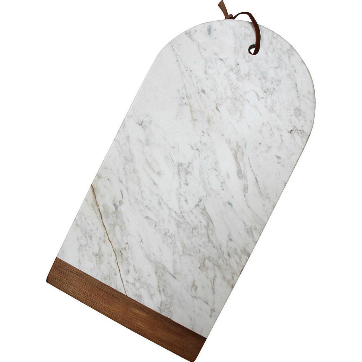 With an elegant and contemporary dome-shaped design, this board will transform any table setting into a picturesque landscape with its unique combination of marble and acacia wood at the bottom. Measuring 38cm in length, 20cm in breadth and 1.5cm in depth, it is a little heavy but that's what keeps it steady! The hole in the marble with the strap gives a way to hang it out of the way in a tight spaced kitchen and also makes it so much easier to hold over the pot or sink to scrape off the contents. It is recommended to hand wash with a soft sponge and warm soapy water and not use abrasive cleaners.