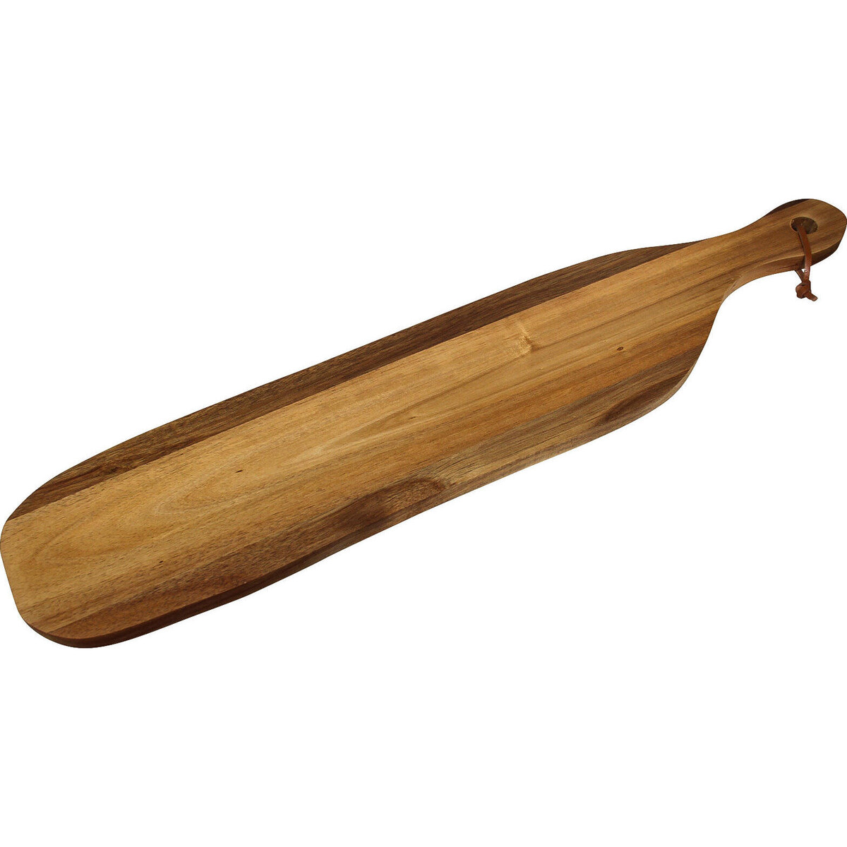 The long design of this board is perfect for serving bread, cheese, pizza slices or pétés in addition to bruschetta and similar meals for a sophisticated self-serve dining experience at a dinner party or family get-together. One side extends out into a handle for easy transportation of the board and also makes lifting easier, which is particularly beneficial when it is heavily laden with food to prevent accidentally spilling. The handle features a leather strap for additional detailing and for hanging the board when not in use. It is not only a practical purchase for a customer but also makes a nice new home gift item.