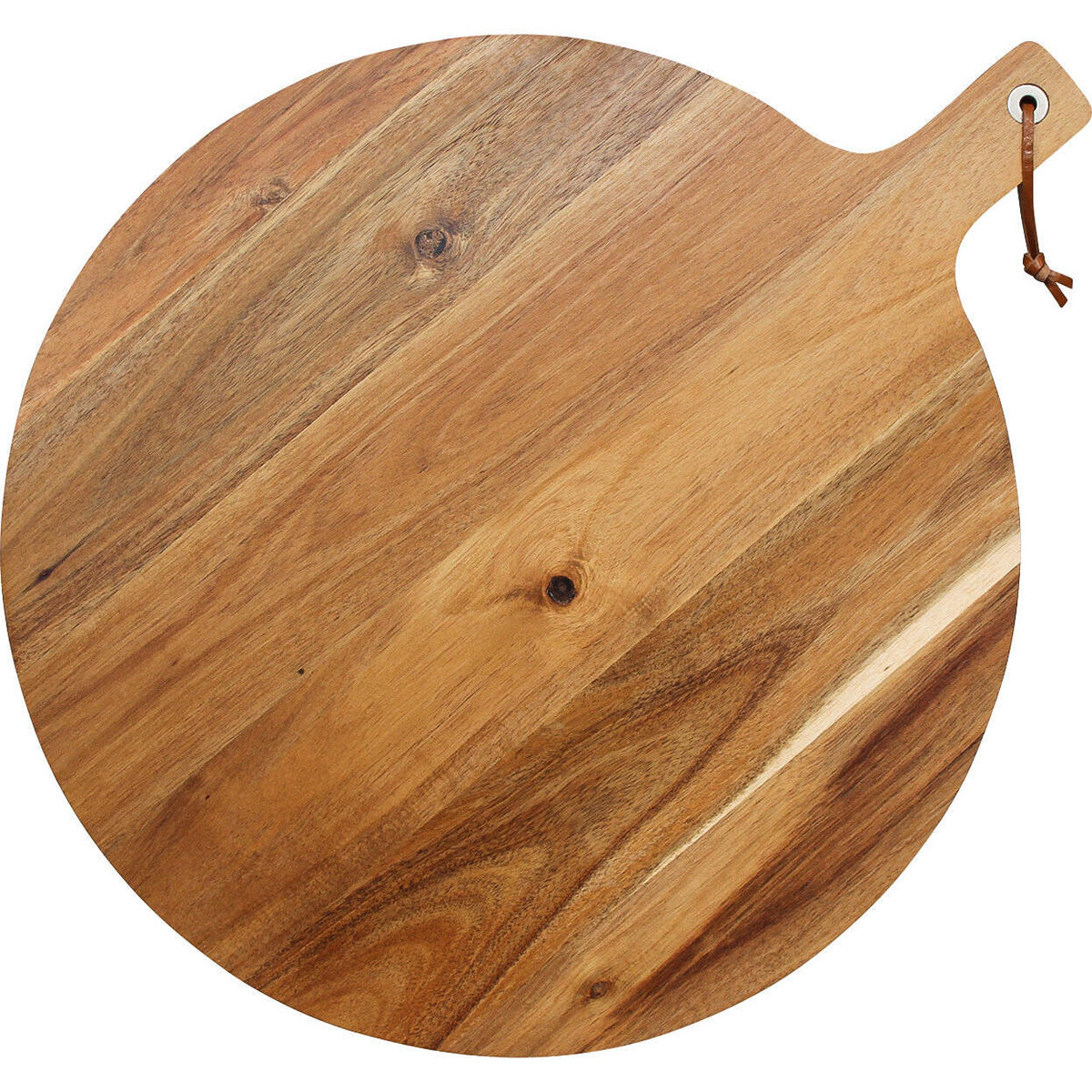Emphasize luxury with this round handled tray that is handcrafted from the naturally exquisite acacia wood for one-of-a-kind beauty and quality. The natural wood grain palette brings an earthy charm to the board and the leather loop in the handle shows on-trend detailing and contrast texture. It is ideal as a server or a practical chopping board at the table to top with dishes and accompaniments to serve to guests. Please allow for differences between each board as to what is pictured due to the individual characteristics of the wood.