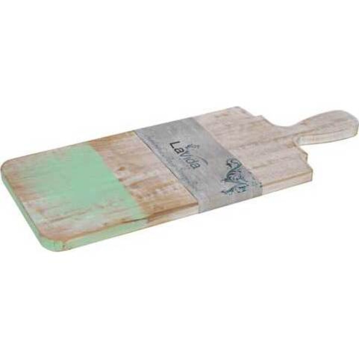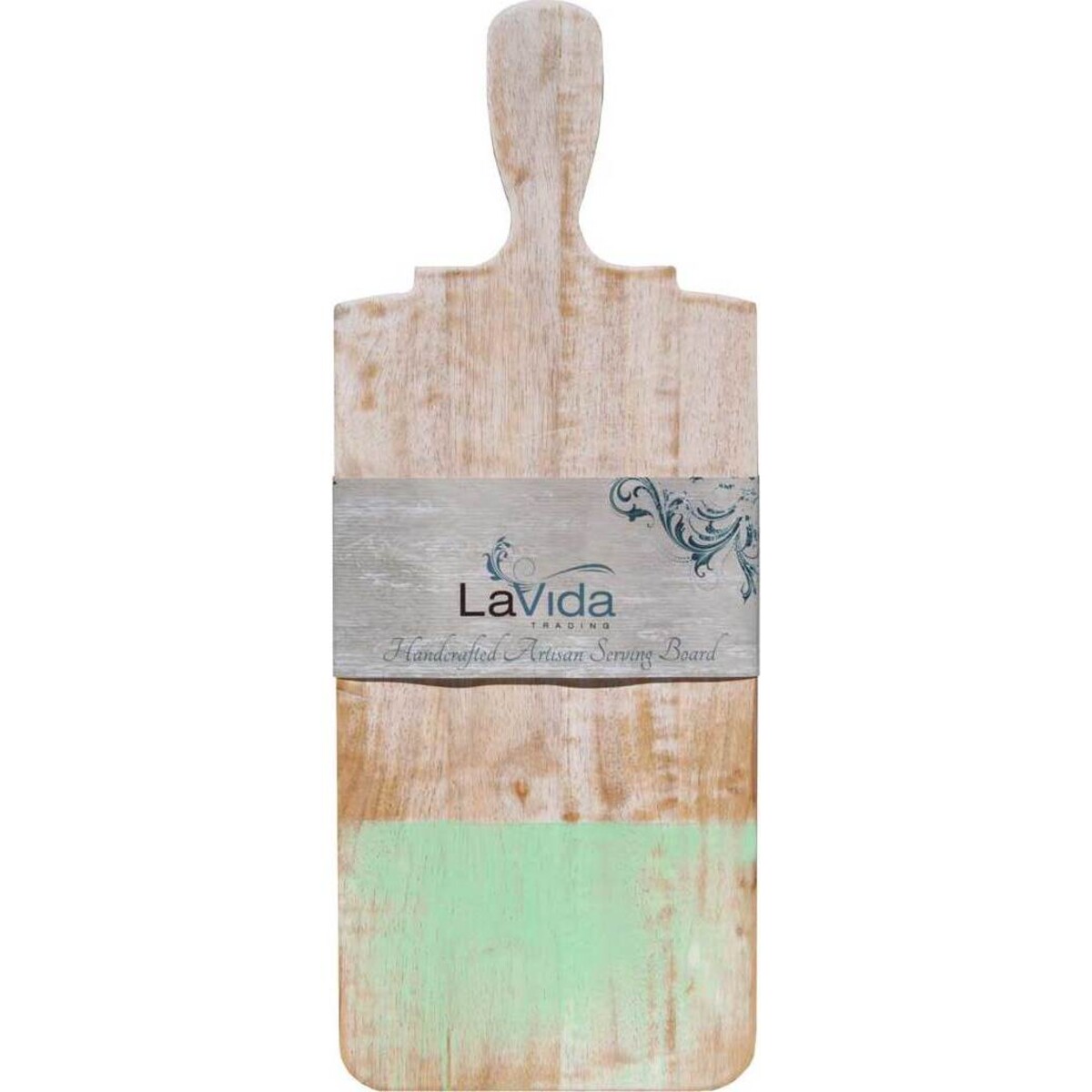 Our Small Sea Green Serving Board features all natural wood that's hand crafted by artisan men and women. Rounded corners at the bottom and squared off corners at the top lead to a lightly scalloped edge and a tapered easy grip handle that's comfortable to hold.