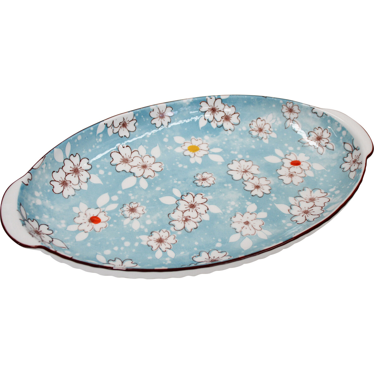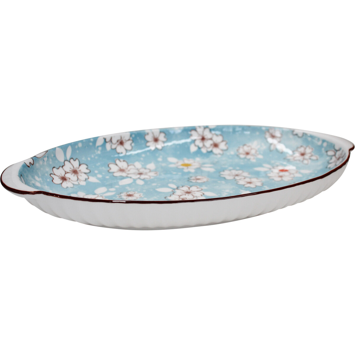 Introducing the Serving Platter Blossom, a captivating piece of tableware that brings a touch of grace to any dining setting. Crafted from high-quality ceramic, this platter measures 32cm in length, 18.5cm in width, and stands 4cm tall, making it the perfect size for showcasing a variety of culinary creations. Adorned with a serene pattern of delicate blossoms spread across a tranquil blue backdrop, this serving platter exudes elegance and invites a serene atmosphere to your table. Tactfully designed, the Serving Platter Blossom isn't just another dish; it's a statement piece that seamlessly fits with various decor styles, from the contemporary home to a more traditional office environment. Whether you're hosting a classy dinner, a casual brunch, or looking for an exquisite decorative item, this platter serves all purposes with finesse. The allure of this piece is its versatility and potential popularity among consumers who appreciate beauty and functionality in homewares. Imagine it laden with hors d'oeuvres at a cocktail party or presenting a home-baked quiche for a family brunch – the Serving Platter Blossom is bound to capture attention and spark conversation. Moreover, its robust construction ensures durability and longevity, making it a valuable addition to any retailer's inventory. Giftware shops seeking to enchant their clientele with items that combine practicality with aesthetic appeal will recognize the appeal of this splendid platter. Its charm lies in its unique design, which not only serves delicious fare but also enhances the ambiance of any space it graces.