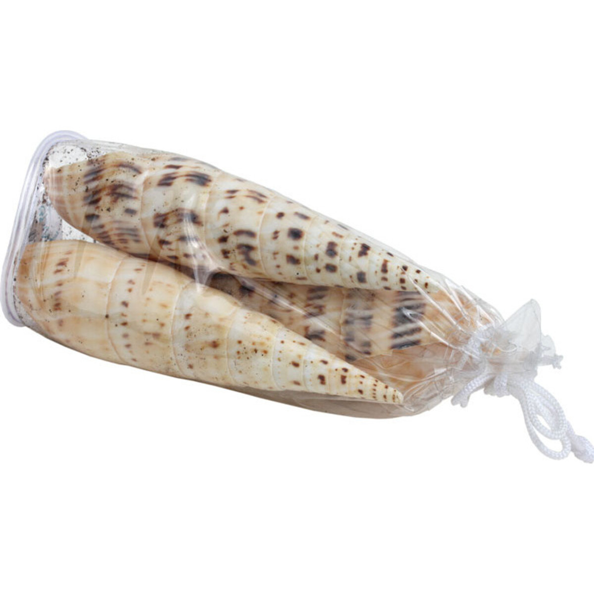 The shells are all about the same size and shape but have qualities and markings that are unique to each. These tan, brown and white shells share the same long cone shape as they are pointed at the top, wider in the middle and have an opening at the end. Their spotty and stretched out brown checkered pattern over a white and tan background allows them to have a look that's all their own. Although they're ideal to use in a coastal themed room, they can also be used outdoors in landscaping or placed around the home as decorative accents. They come in a small plastic bag that keeps the shells clean, organized and dust-free.