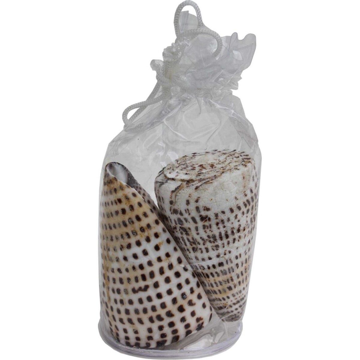 There are two similarly sized shells in each bag, but each has their own unique look and distinctive pattern. Also known as Leopard Cones, these brown, tan and white shells are cone shaped with a rounded point at the top, a wide base and an opening that stretches from end to end. Their stunning brown checkered pattern over a white and tan background gives them a fun and funky look that's ideal to display around the home, especially in rooms that have a coastal, contemporary, eclectic or traditional theme. Use them in landscaping, make jewelry with them or put them in a jar as a centerpiece on the table. They come in a clear bag that knots at the top for easy storage.