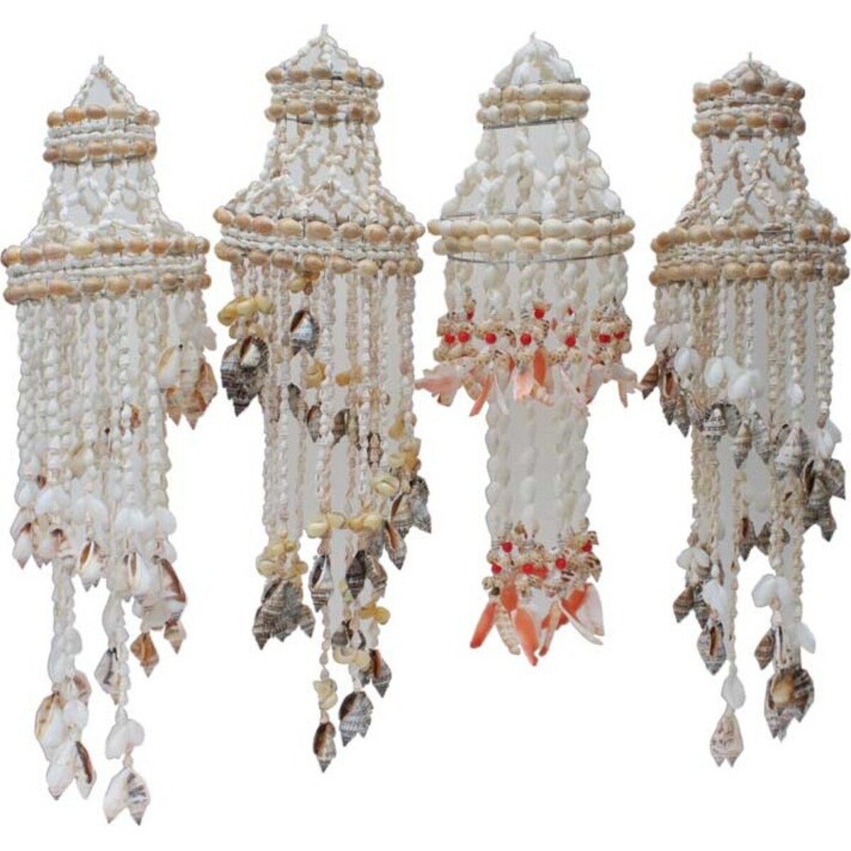 All of the individual shells are just as lovely and charming as the wind chimes are as a whole. The first wind chime is comprised of white and tan shells, two are made up of white, tan and brown shells and the last consists of white, tan and pink shells. One chime is set in two separate layers with the largest section at the center and a thinner section hanging below while the other three are set in a swirled design. Horizontal lines of tan shells section off each wind chime into different layers The wind chimes can all hang together as a collection or as individuals in various areas of the home.