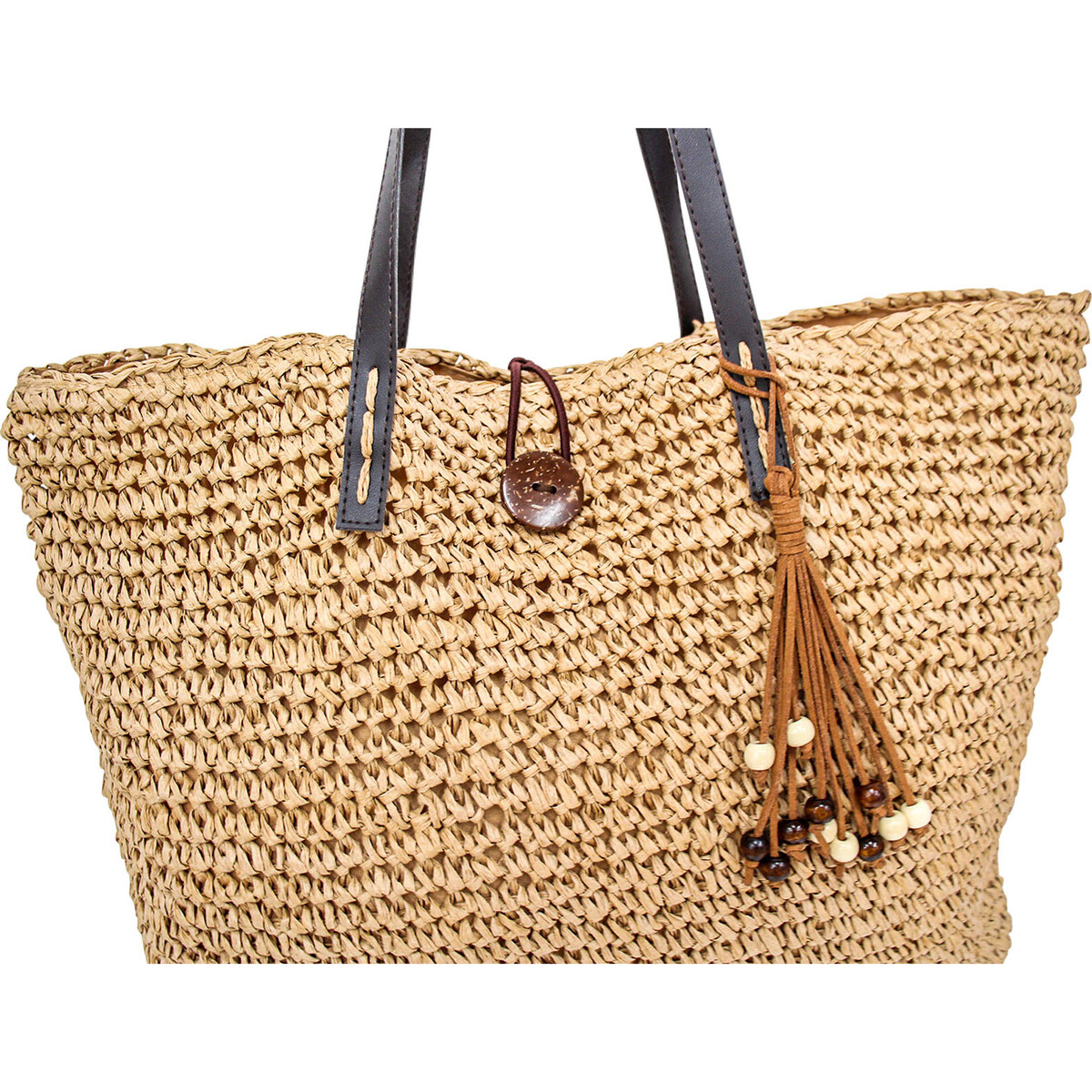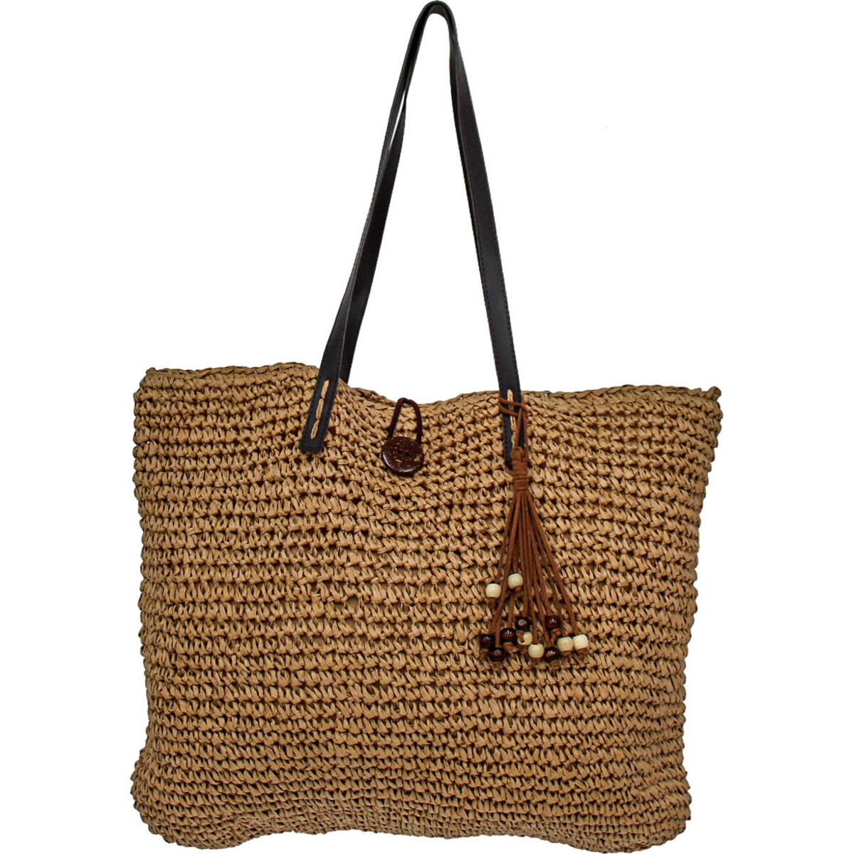 The Shopper Woven Natural is a shopper's delight in that it comes in just the perfect design. It is woven intricately using top quality rice paper and left in its natural, unspoilt brown colour. Not just that, it has such a big capacity which means the customer gets to be able to buy more without thinking about space. Plus, it has an ergonomic 23 centimetre black handle which makes carrying and handling easy and stress free. When shopping is done and over, the customer only needs to pin the latch to a button designed for that purpose. It even comes with colourful beads of white and indigo dangling from several leather threads. Place your order now.
