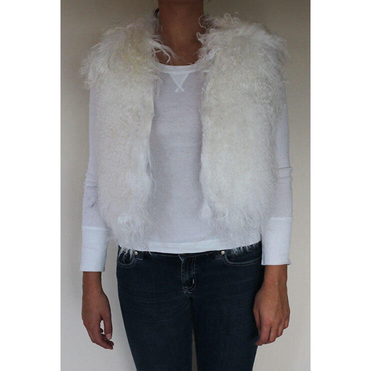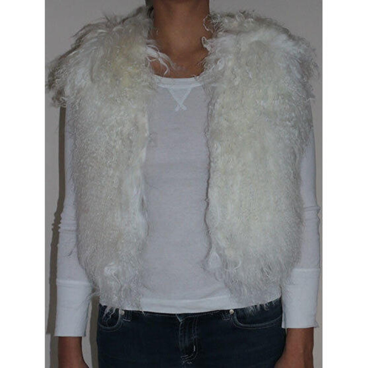 Make a great new seasonal beginning with the choice of this warm and lightweight lambs wool vest that makes your style statement in clothing go right on top and keeps you warm and comfy through those cold windy days. Wear it atop vest, blousons and shirts, with jeans or skirts - whichever way, the lovely lightweight wool, the soft feel of its knit and the colour will only go to enhance your look in so many ways. The raw unfinished look enhances the impact, the woolly feel, is dense despite its very loose feel - the loose yarn feels, the unfinished feel of the edges and the short length makes it one of those vests that can be paired with most of your clothing options. A soft white shade that could coordinate well with all kinds of colours of outfits, this vest has a single closing lapel and a waist length to make it a frisky lightweight little furry jacket to welcome the Fall or Winters with!