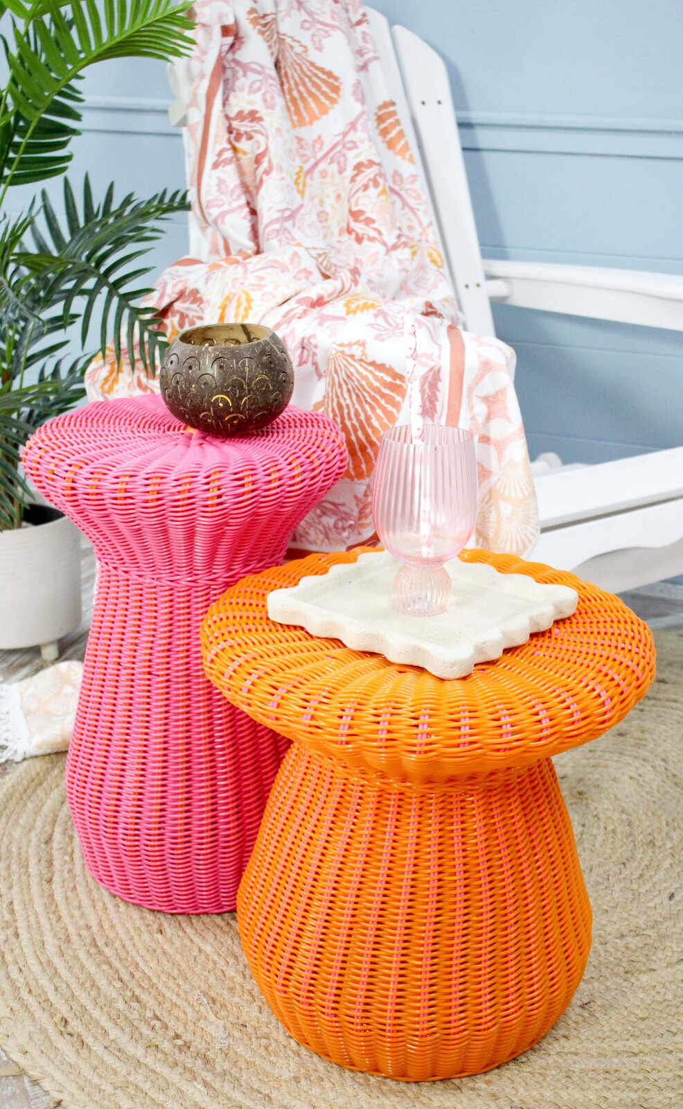 Our Side Table All Weather Fussia Tall is a real head-turner with its bold fuchsia and orange woven finish. The 60 cm height and sturdy coated metal frame make it a standout piece for both indoor and outdoor spaces. We love how versatile it is - perfect as a side table, stool, or just an eye-catching decor accent to brighten up any space your customers might have in mind.
