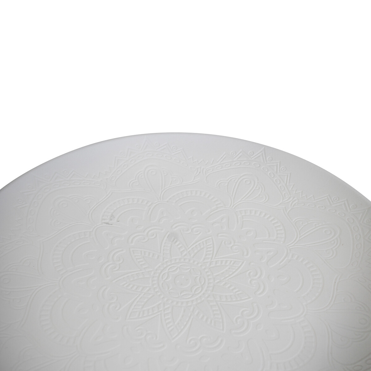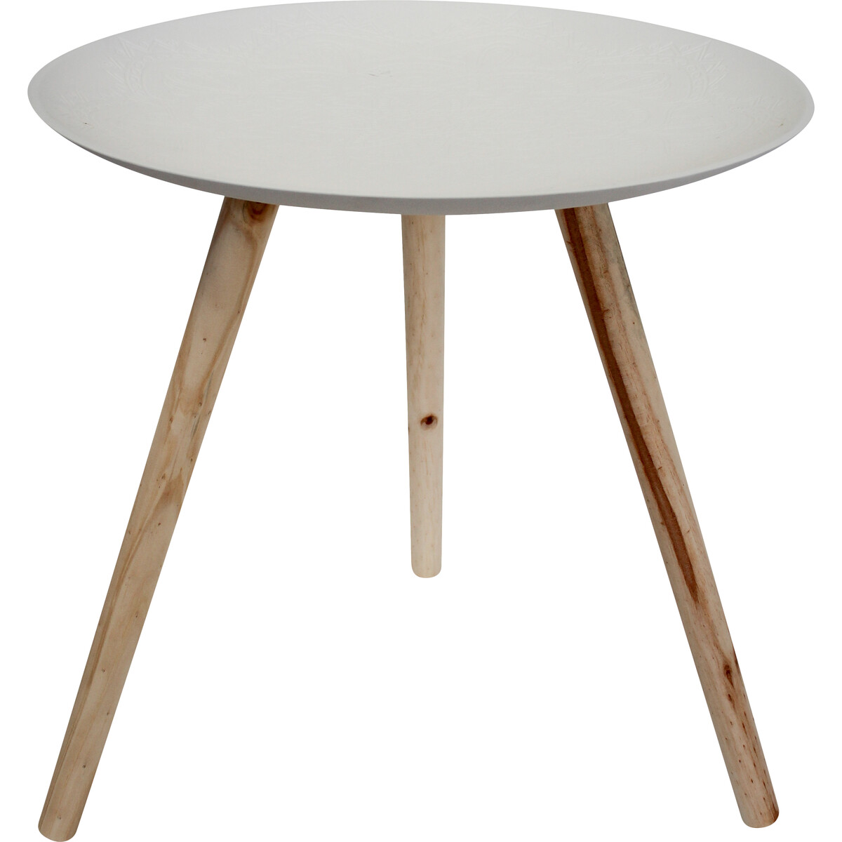 Crafted in a large sized dimension which measures 49 centimetres in length, 49 centimetres in width and a total of 48 centimetres in height, this table stands tall and distinctive via the aid of a tripod stand which consists of three wooden legs. Sitting on these three stands comfortably is a spherical shaped, even surface wooden platform which is smooth textured and painted an immaculate white hue. This white top blends in smoothly with the wooden brown finished stands which gives support to this section of the table. There are eight of these tables in every carton quantity that you order today.
