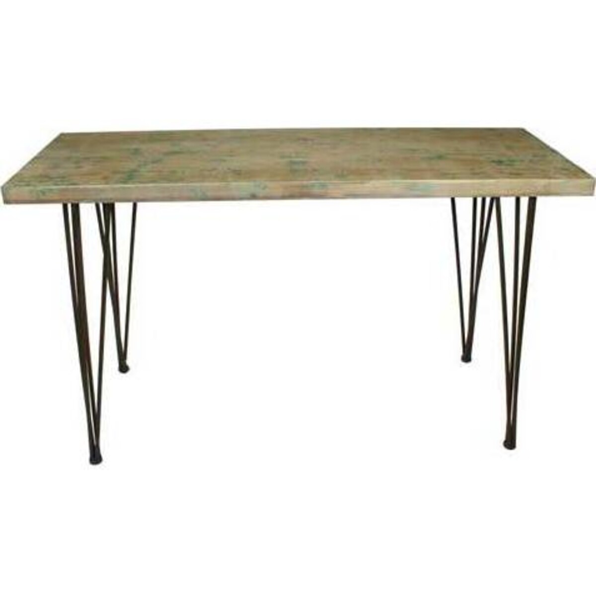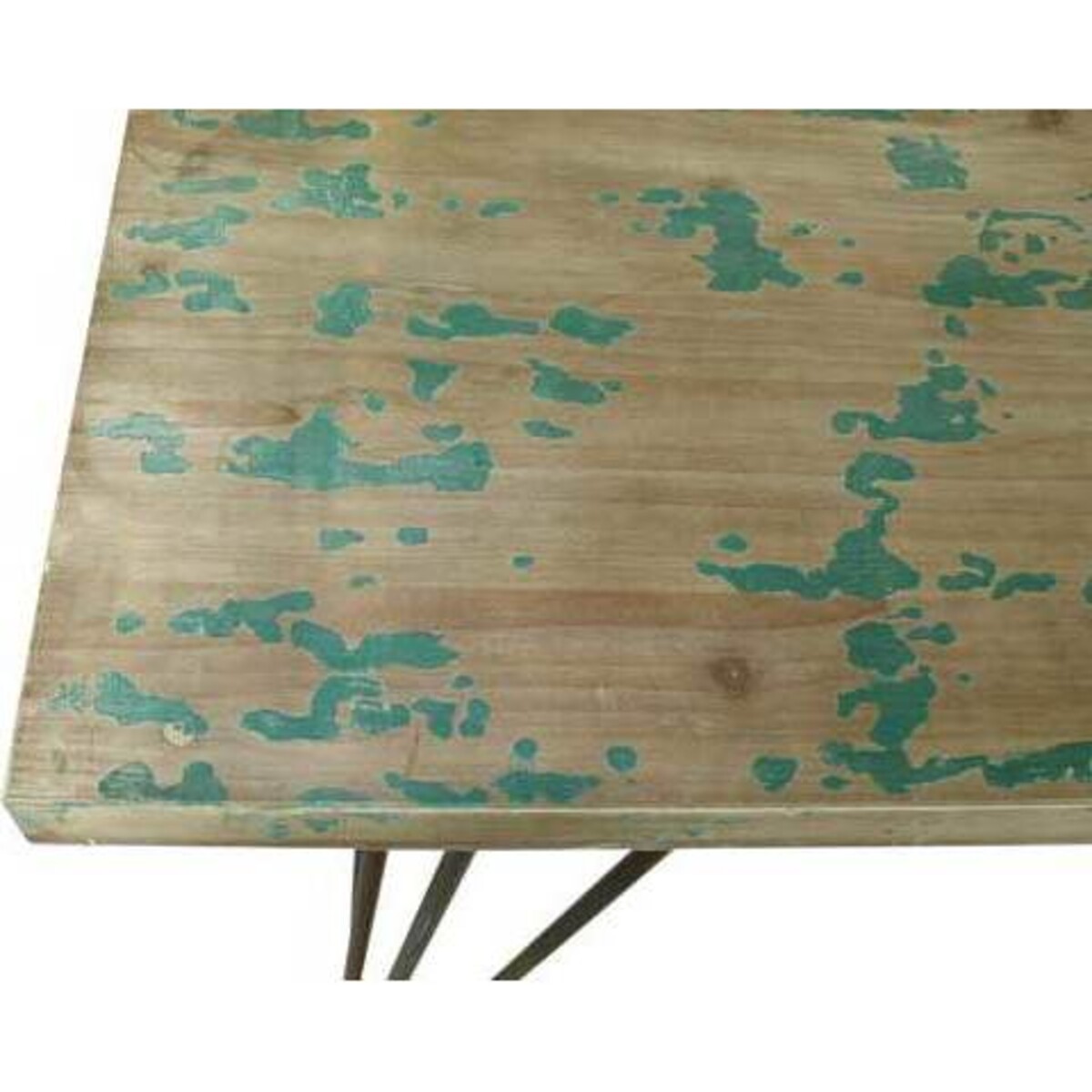 This 121 cm long table has been fabricated from wood and metal. Its legs are stable and made by a simple turning of metal rods reinforcing their strength and ability to hold a good amount of weight. The table has a height of about 76 cm and a width of 40 cm , making it perfect for those spaces and those moments when the guests swell in numbers and more space has to be created for placing different things, maybe extra, food, plates or even making a décor corner using plants and artifacts. There are so many ways by which this table can be utilized. It could be shifted outdoors as its charm would fit in as much in the outdoors as in shabby chic areas of oneés home. The shabby chic table top with patches of blue paint and the unpolished wood finish add more charm to this piece. The table can blend in well with any kind of furniture that may already be in use owing much to its muted colours and its simple styling.