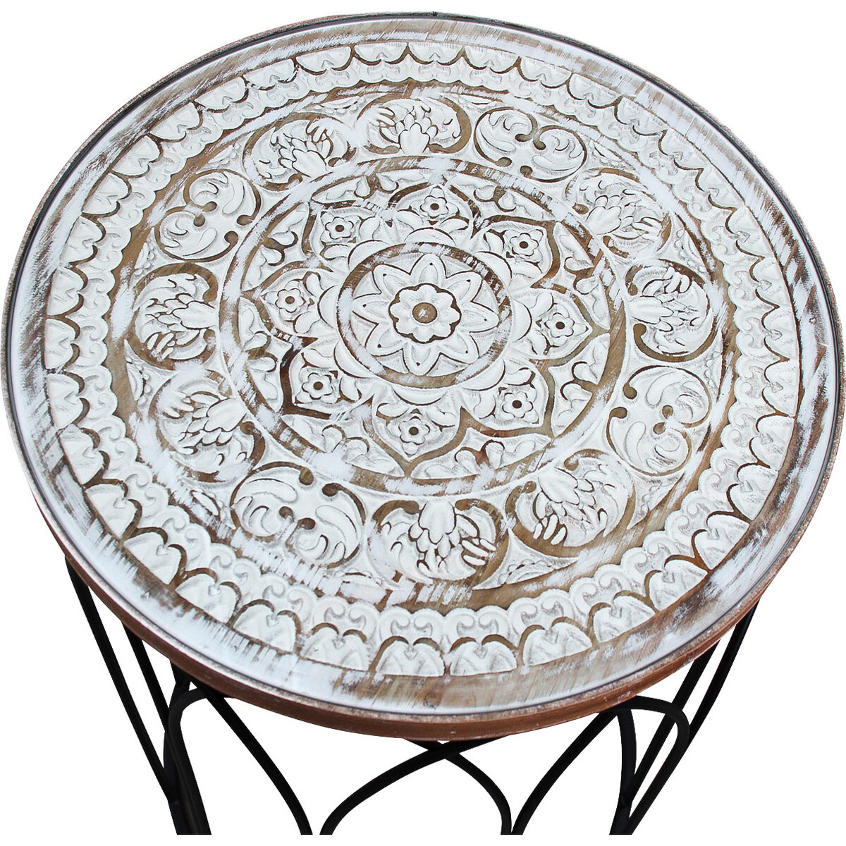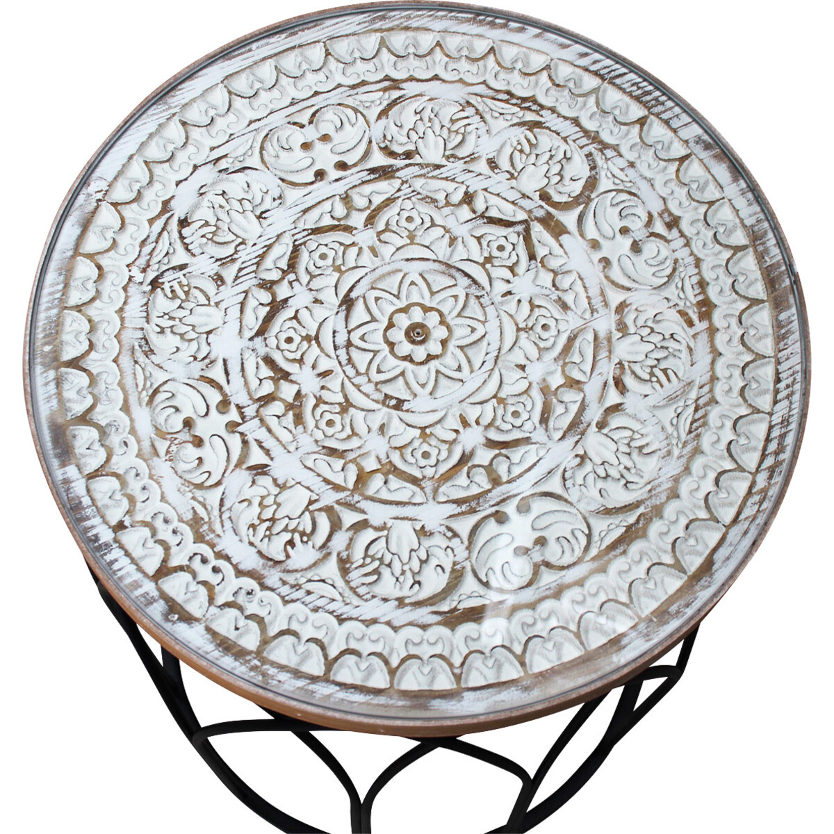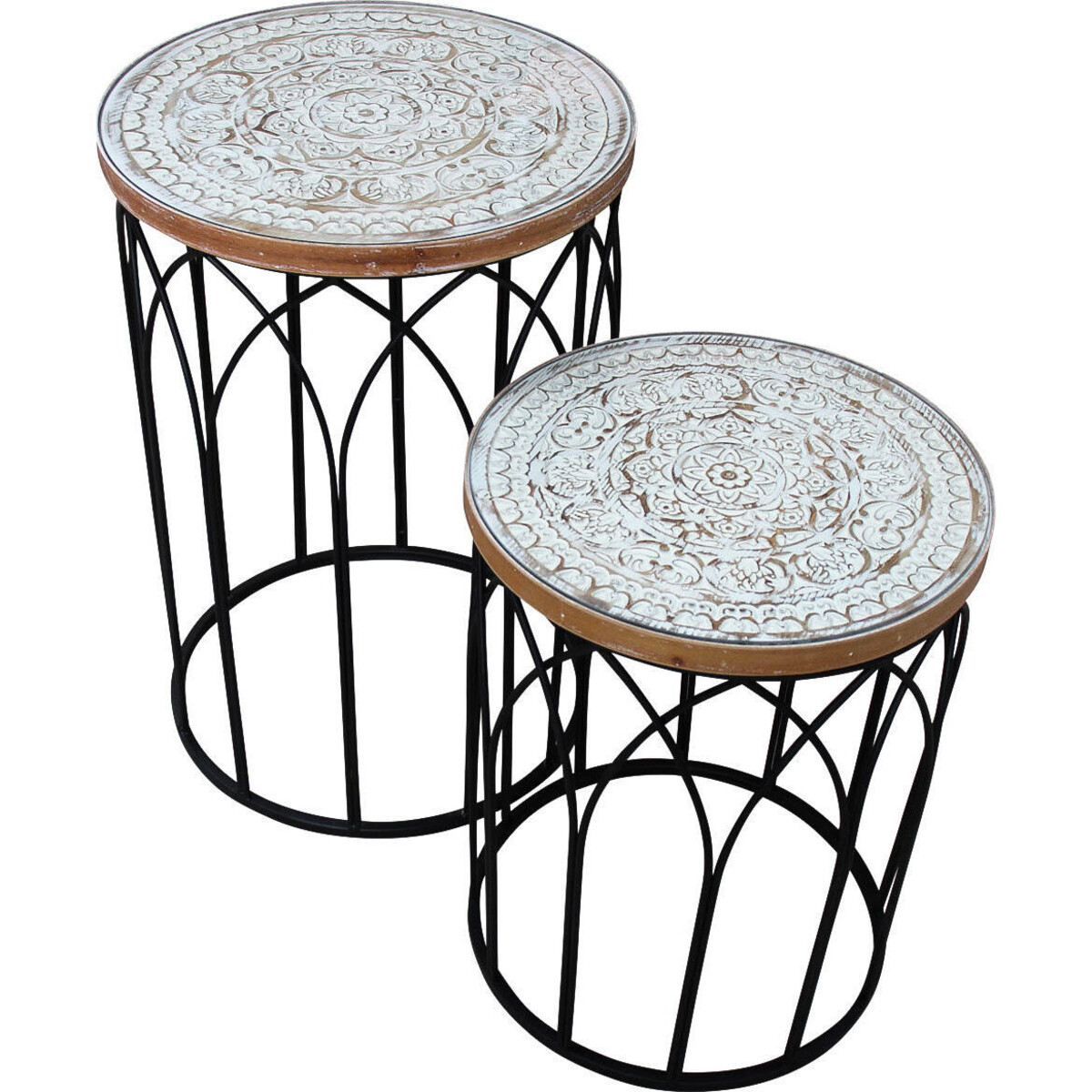 You always reach for them, perhaps to place your book, or to display that new décor piece that you are really proud of-but more so when seating spaces need to be more functional you would always need that side table to keep things functionally active-be it to place your drink or to add that flower vase to add more colour to the corner of the room. Made from sturdy timber the iron frame work gives stability and strength to the round tables. The inlaid glass pattern adds to its classic beauty ad the colour wash makes it modern in design and feel. The smaller table can fit underneath the larger one when not in use. A wonderful contrast of dark coloured iron legs and the white and beige coloured top lends it a fine loo and appeal. The taller table is about 45 cm in dimeter and the smaller is about 31 cm making them large table top spaces for any room.